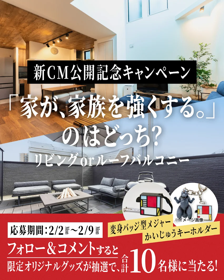 「オープンハウスグループ【戸建】公式openhouse.gr」のアカウントをフォローし、コメントをしていただいた方の中から抽選で各5名様に「変身バッジ型メジャー」と「かいじゅうキーホルダー」が当たります。