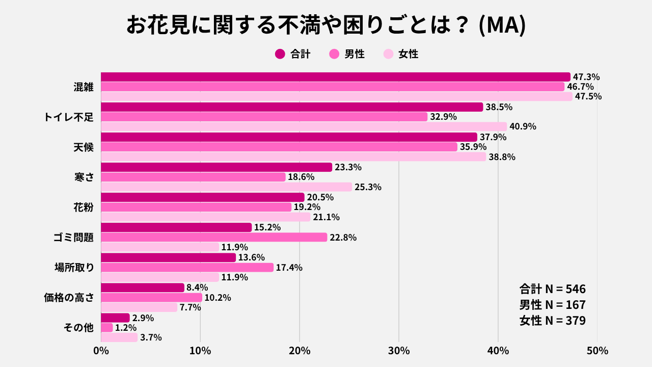 お花見に関する不満や困りごとでは、 「混雑 (47.3%) 」 が男女共通でトップとなりました。次いで 「トイレ不足 (38.5%) 」 、 「天候 (37.9%) 」 と続きます。