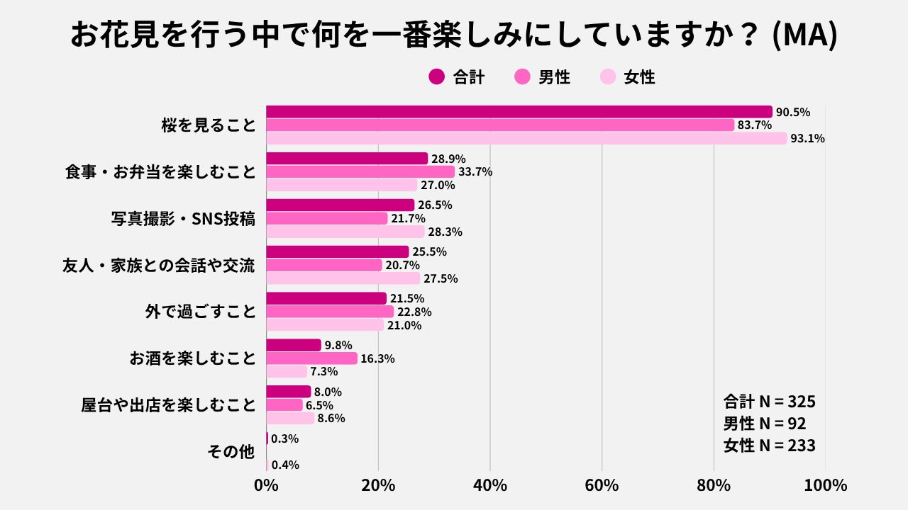お花見で最も楽しみにしていることのトップは、男女ともに 「桜を見ること (90.5%) 」 でした。桜そのものの美しさが最大の魅力であることは不変です。