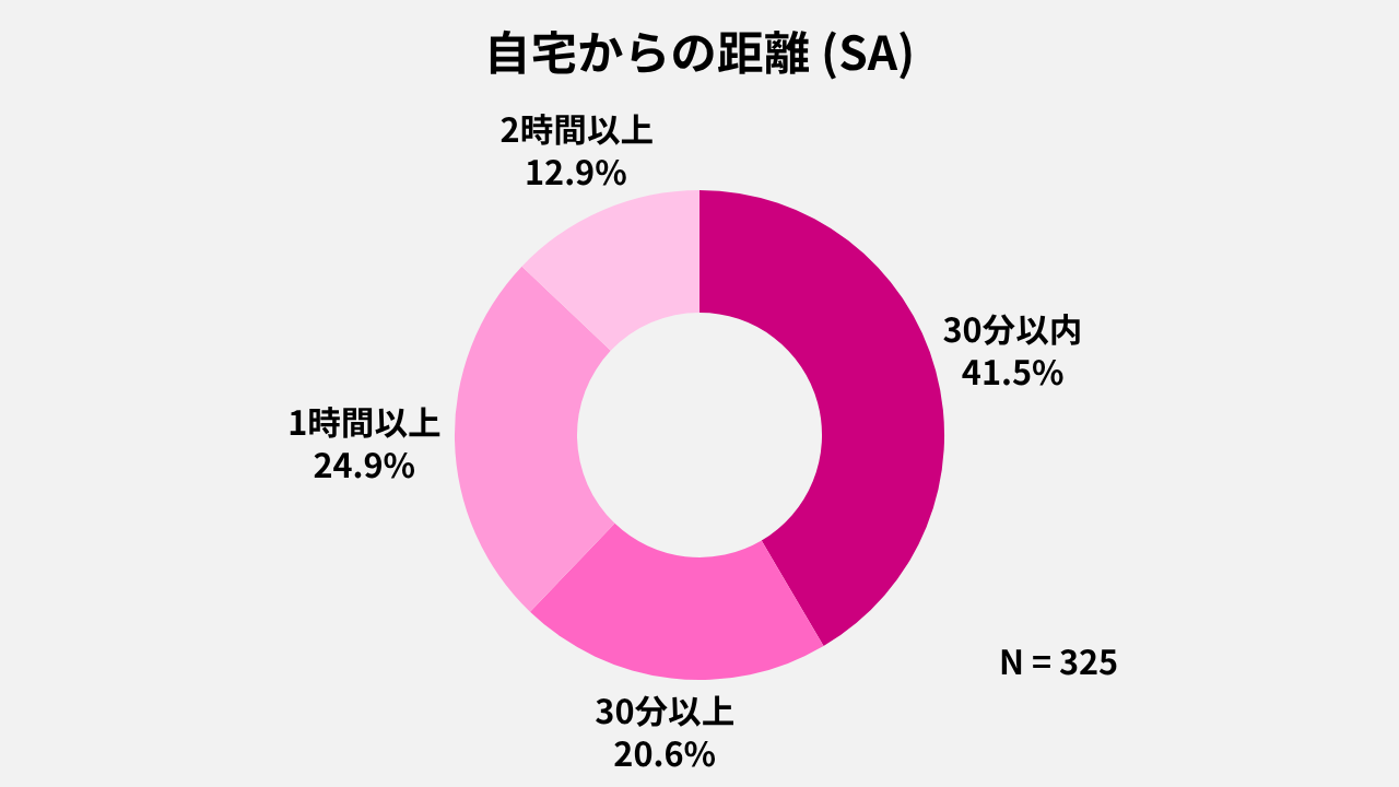 お花見に 「行く」 と回答した方 (N=325) に、会場までの移動時間を尋ねたところ、「30分以内」 が41.5%と最も多く、次いで 「1時間以上 (24.9%) 」 、 「30分以上 (20.6%) 」 となりました。 「1時間以内」 で考えると、実に6割以上 (62.1%) を占めており、多くの人が遠出をするのではなく、自宅近くなど手軽にアクセスできる場所を選んでいる実態が明らかになりました。