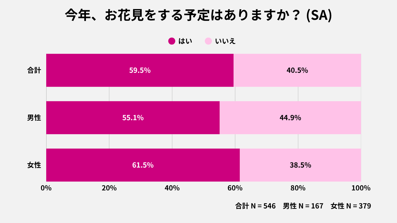今年のお花見の予定を尋ねたところ、全体の 約6割 (59.5%) が 「はい (行く予定/すでに行った) 」 と回答しました。コロナ禍を経て人々のライフスタイルが変化したものの、お花見というリアルな季節イベントへの参加意欲は依然として高いことがうかがえます。