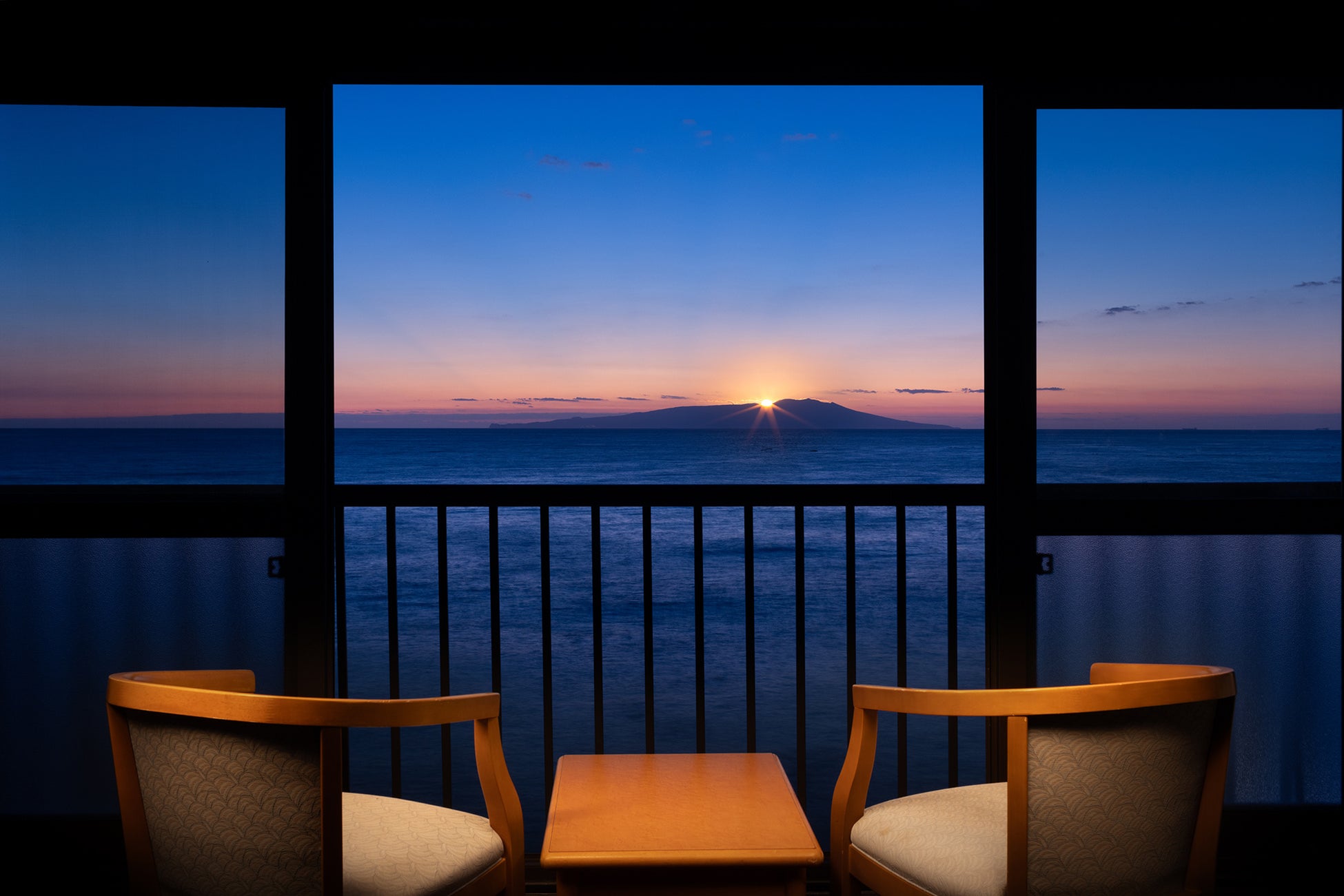 *海に昇る朝日と伊豆大島、満月の前後に「ムーンロード」を望む和室