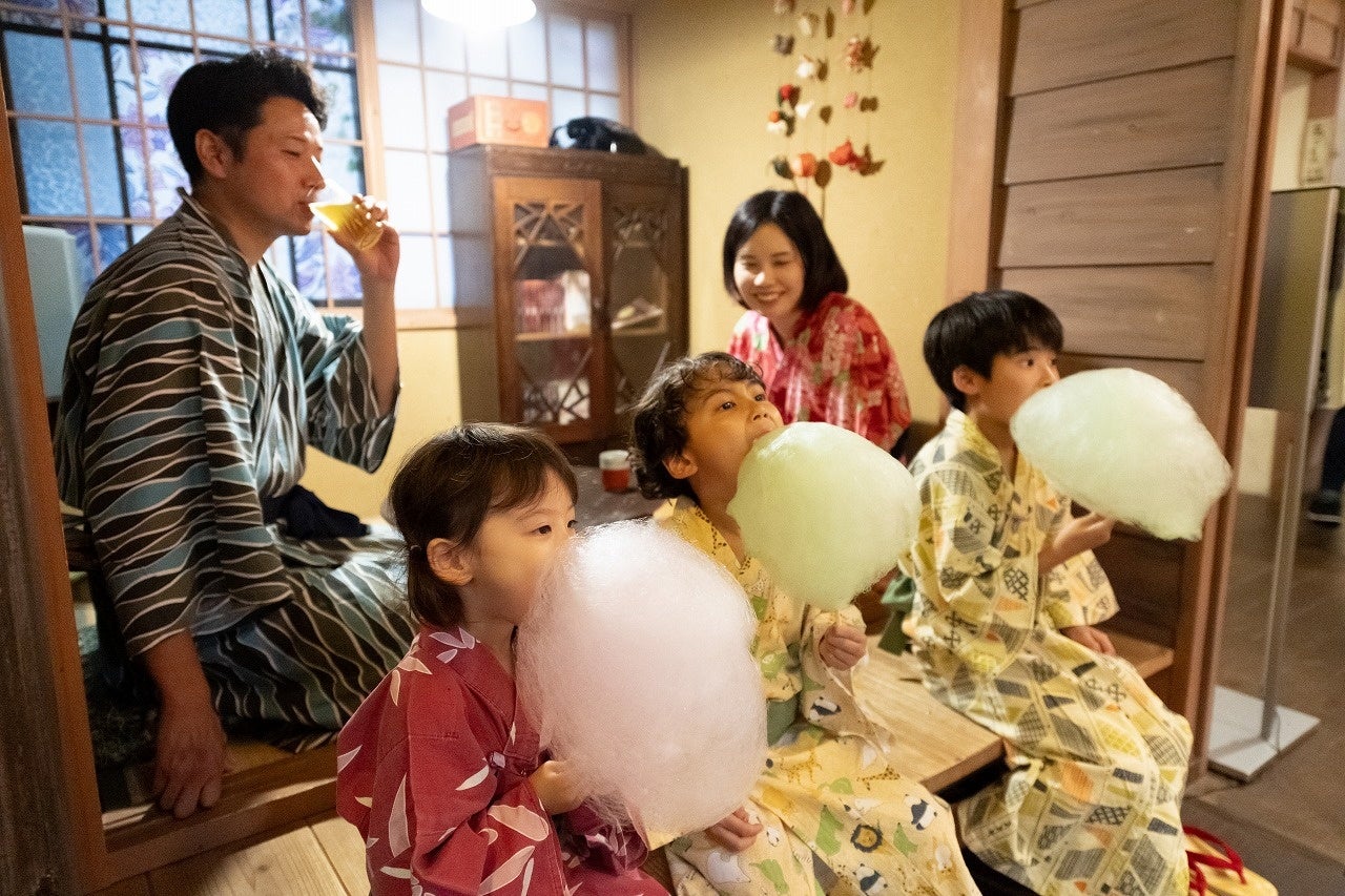 館内の昭和レトロな「つるや甘酒横丁」では、お子さまに「さくら綿あめ」をプレゼント。プラン特典として、お菓子の舟盛おしゃべりセットや桜パフェ、花火、縁日チケット300円分を進呈します。