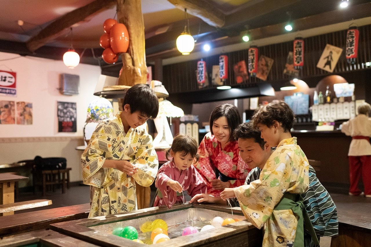 昭和レトロな横丁で、射的やスマートボール、ヨーヨー釣りなどの縁日遊び、伊豆焼酎やラムネなど、昭和の世界観が気軽に楽しめます。夕方の湯上りのビール1杯(16:00~17:20)、つるや自家製甘酒の無料サービスも好評です(16:00~21:00)