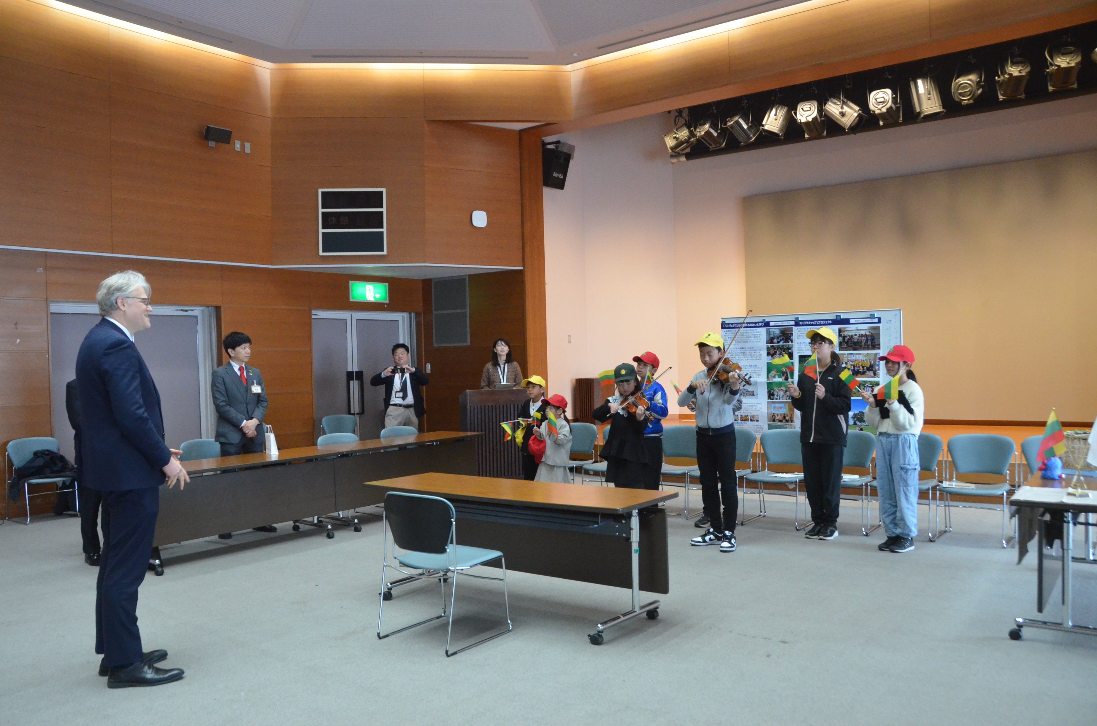 児童を代表し、2年生と6年生のきょうだいがバイオリンでリトアニアの国歌を奏でると、他の児童たちも小旗を振って大使を歓迎。リトアニア国旗カラーのネクタイで出迎えた稲田恒久校長とともに、心温まるひとときをつくりました。「素晴らしい演奏でした」と大使も感激した様子でした。