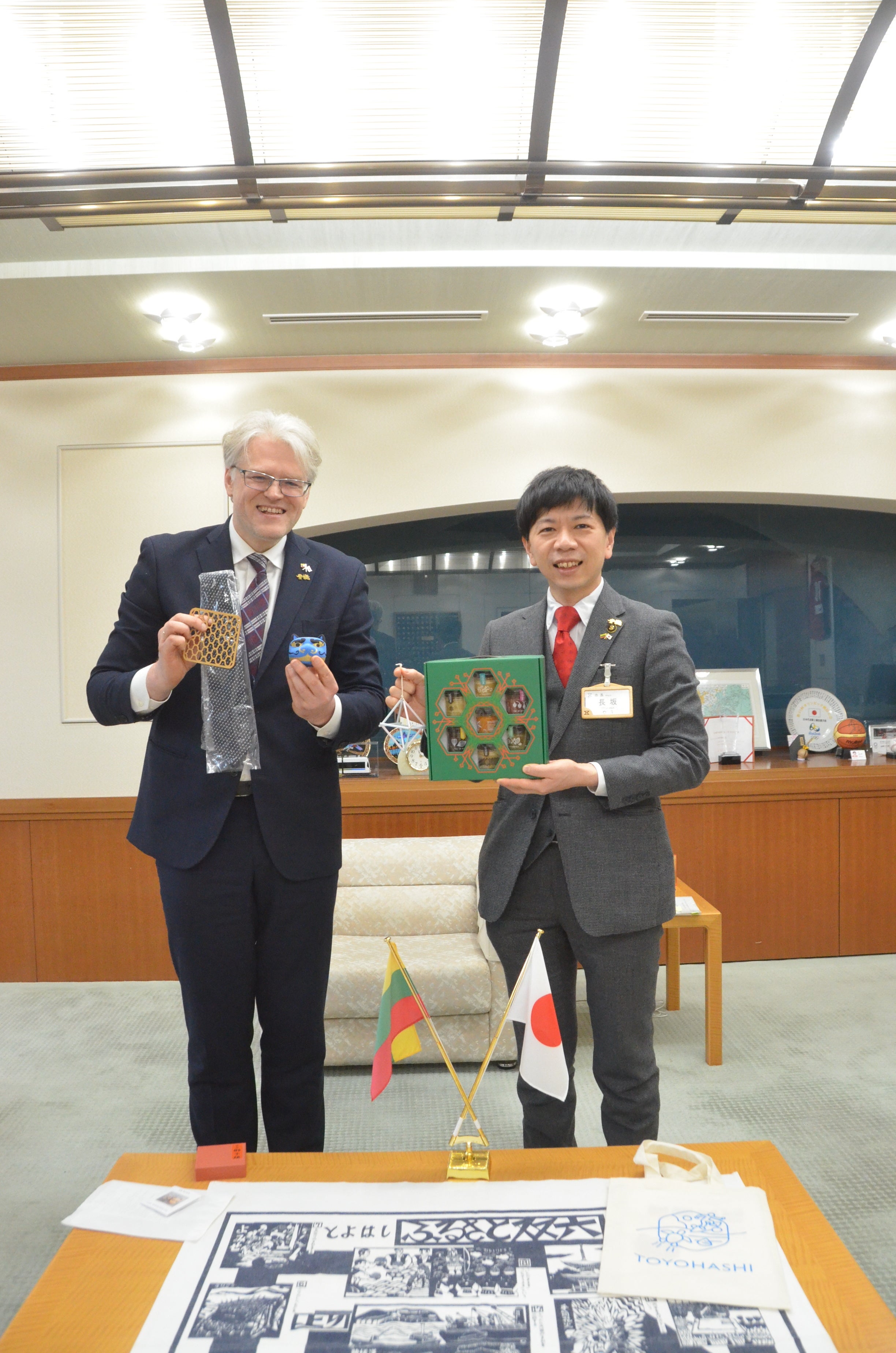 今後の交流については、豊橋をホームタウンにするプロバスケットボールBリーグのチーム(三遠ネオフェニックス)があることから「(豊橋は)バスケットボールチームが強く、バスケが盛んなリトアニアとスポーツを通じた交流ができるのでは。また、パネヴェジス市は産業都市でもあるため、経済的な交流もできたら」と提案。これを受け、長坂市長は、製造業のほか、農業も盛んな豊橋の産業を紹介しました。互いに記念品も贈り合い、さらなる協力関係を誓いました。