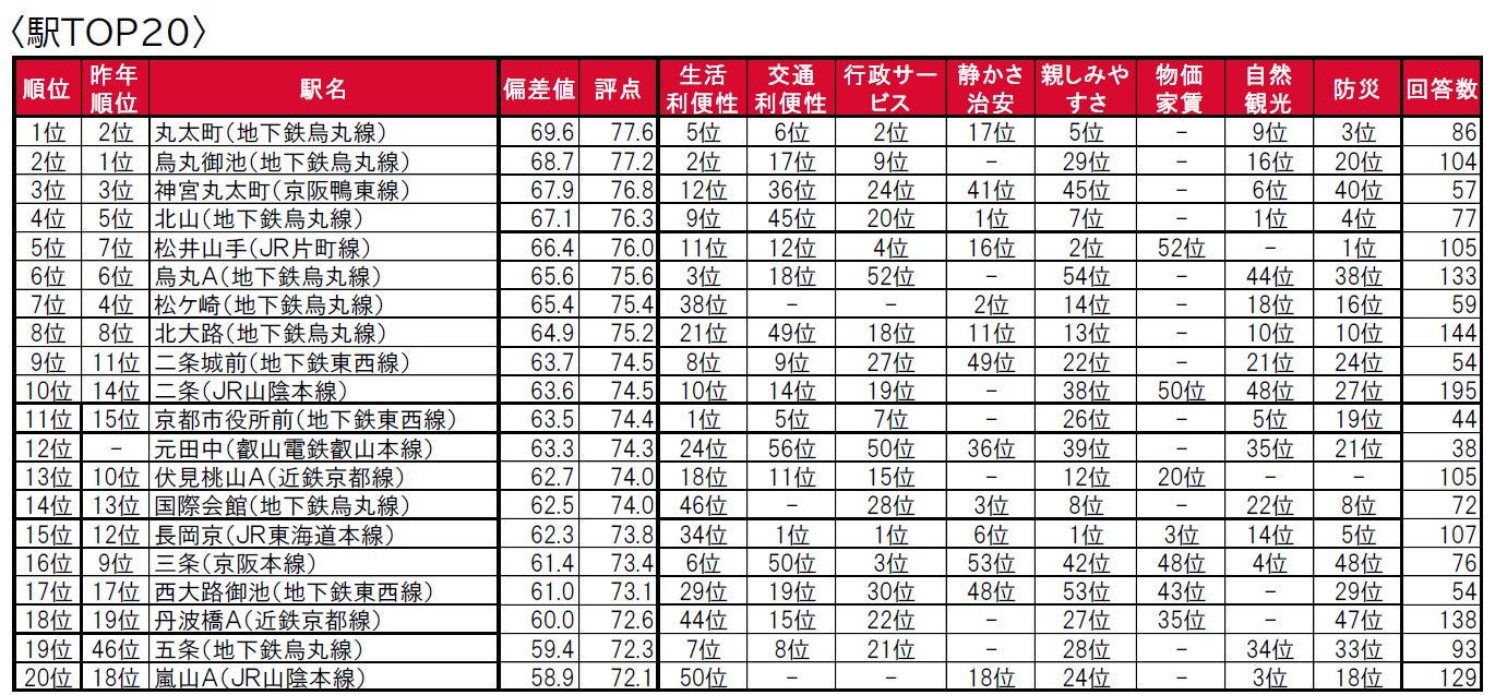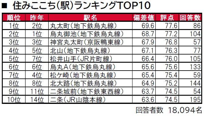 1位は丸太町(地下鉄烏丸線)で、昨年2位から順位を上げました。2位は、昨年1位の烏丸御池(地下鉄烏丸線)です。3位は、2年連続で神宮丸太町(京阪鴨東線)です。トップ10内では、地下鉄烏丸線沿線の駅が昨年に引き続き6駅ランクインしています。