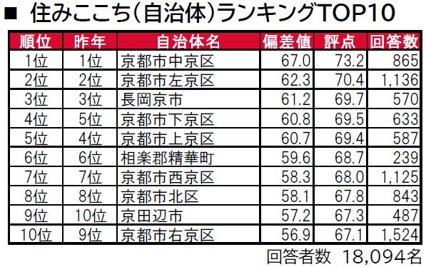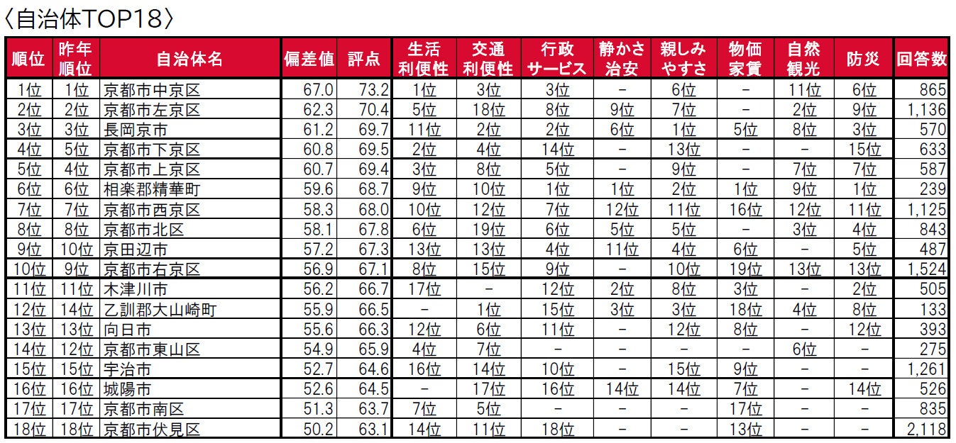 4年連続で、京都市中京区が1位に輝きました。2位と3位は3年連続で京都市左京区と長岡京市です。トップ10の自治体は、昨年から順位の変動はあるものの、顔ぶれは同じという結果になっています。