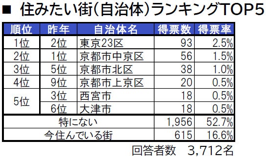 1位は、昨年2位だった東京23区、2位は、昨年1位の京都市中京区です。3位は京都市北区で、昨年5位から順位を上げています。トップ5では、京都府の自治体の他に、1位の東京23区と、5位の滋賀県大津市がランクインしています。