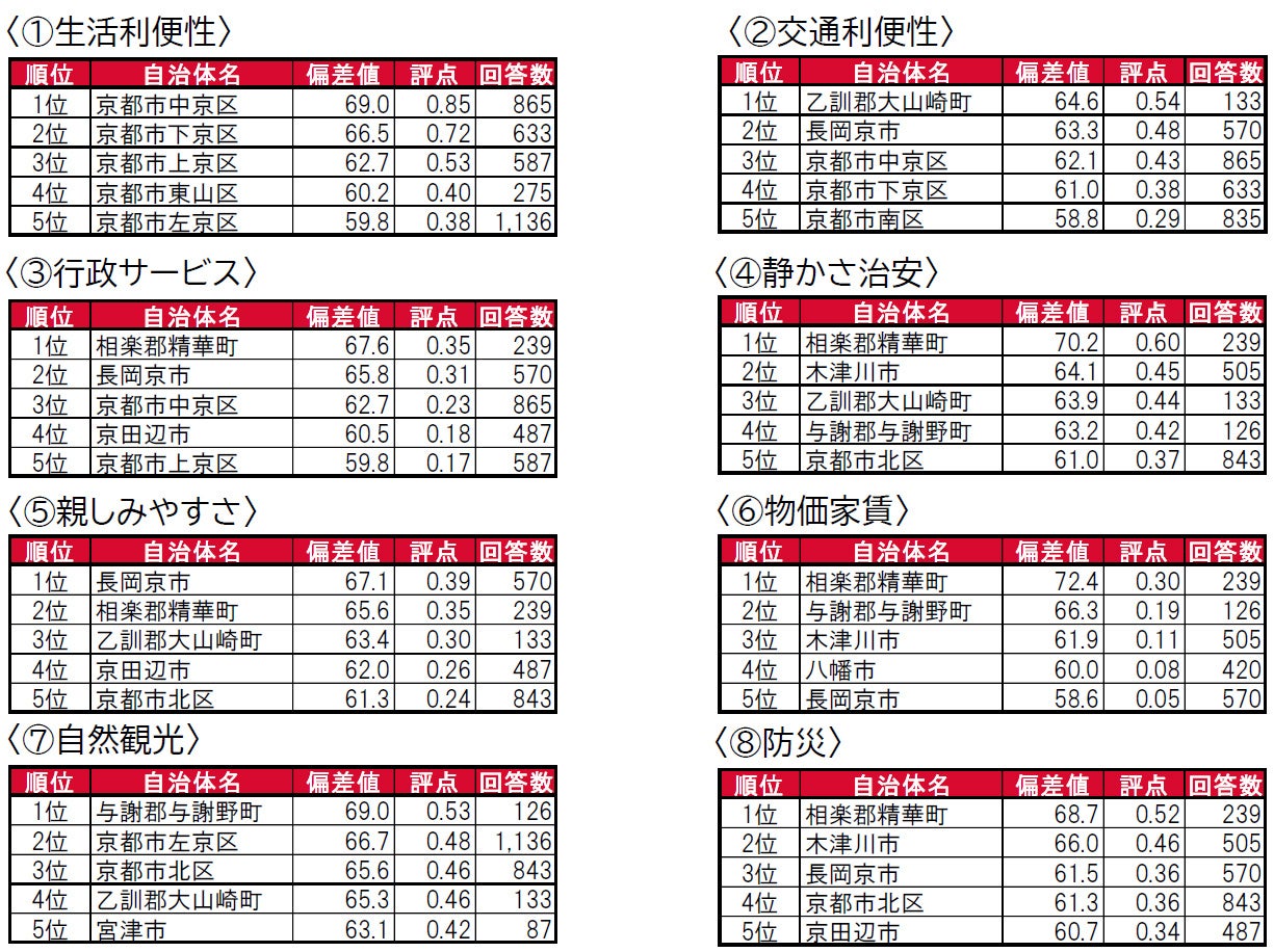●「生活利便性」因子では、昨年に引き続きトップ5はすべて京都市の自治体が高い評価を得ています。