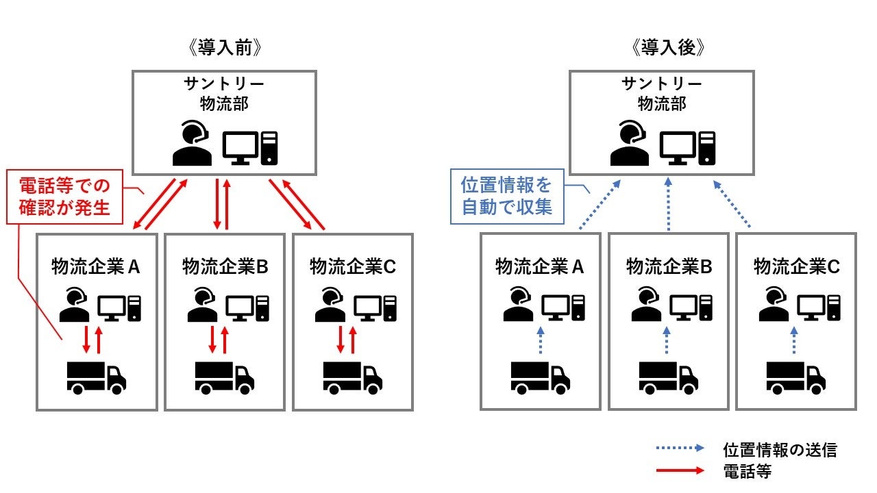 酒類・飲料を製造・販売するサントリーグループでは、年末年始やゴールデンウィーク、夏季などに配送量が大幅に増加します。それに伴いトラックの現在地などの配送状況を確認する頻度も高まり、その対応は物流企業・ドライバー・当社それぞれの負担となっていました。