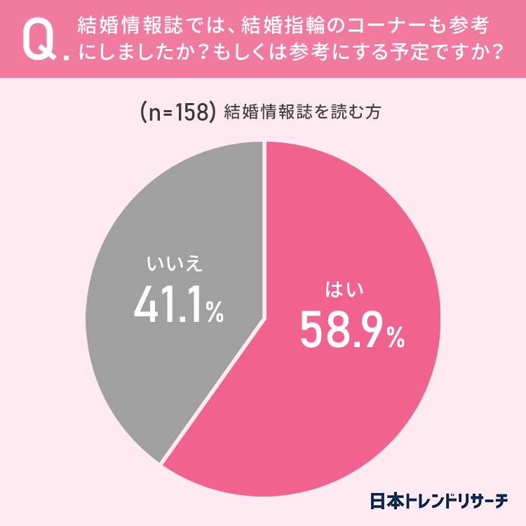 58.9%と半数以上の方が「結婚情報誌の中にある結婚指輪のコーナーも参考にした(もしくは参考にする予定)」と回答しています。