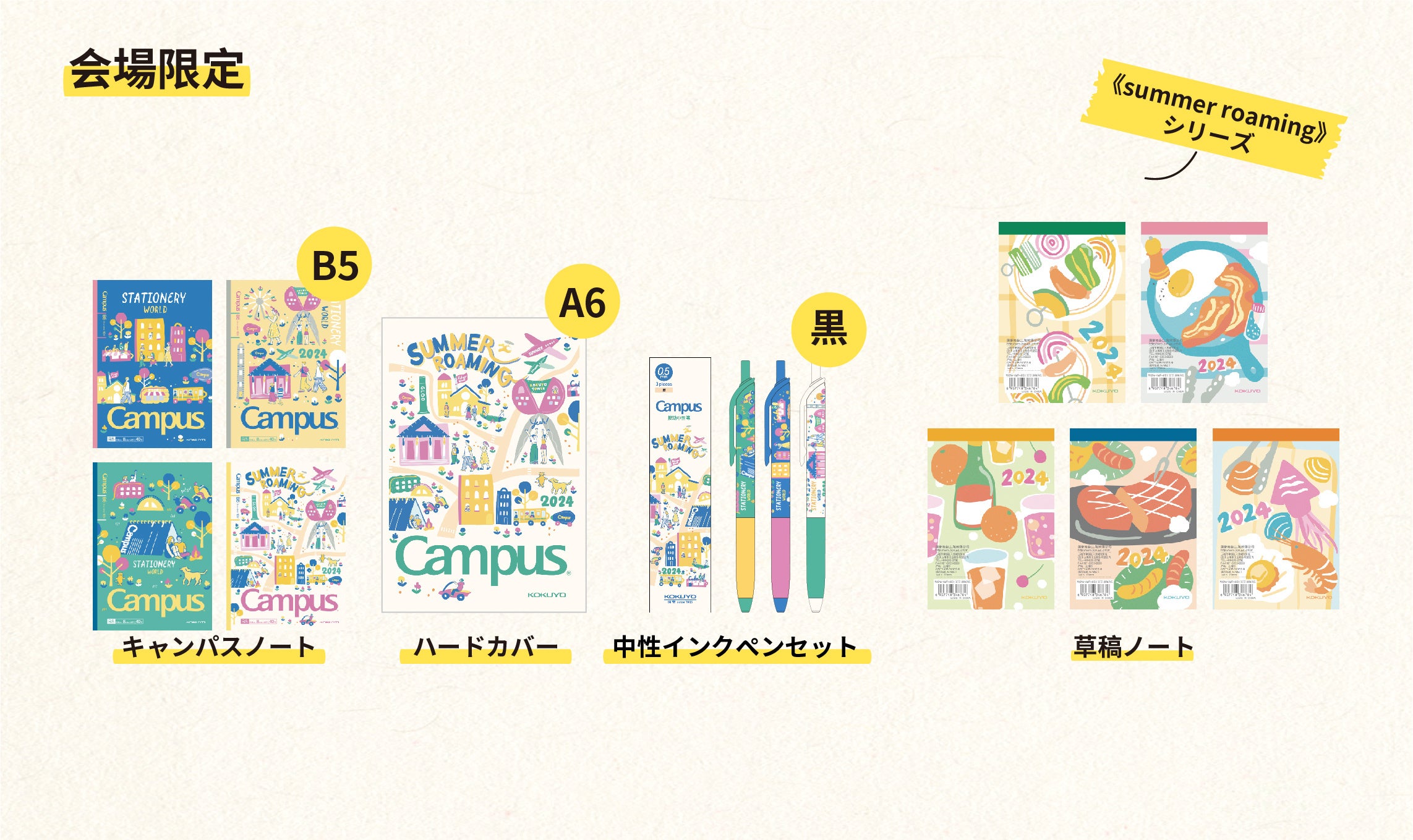 本年は、近年忙しい現代社会における癒しの手段として注目されている「City walk」から着想を得て、「SUMMER ROAMING(サマー ローミング)」をテーマに、会場内を文具巡りができる1つの街「KOKUYO TOWN」に見立て、限定品や他ブランドとのコラボレーション等、約800品番の商品をご用意してお客様をお迎えします。