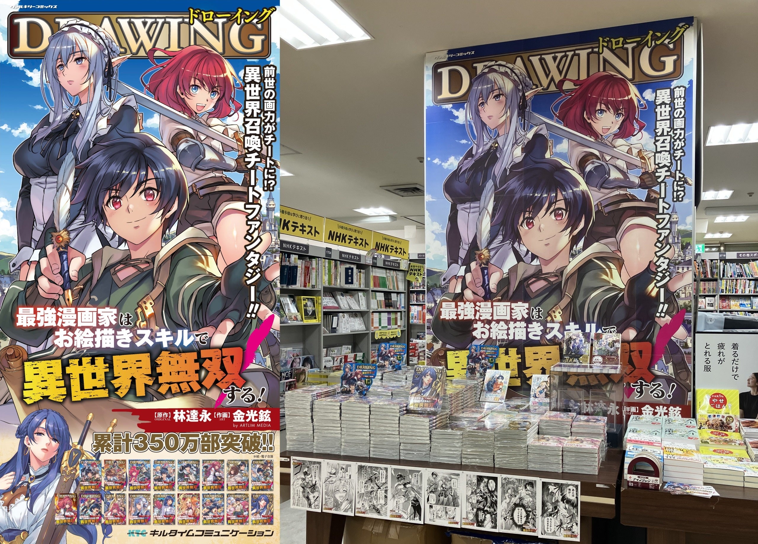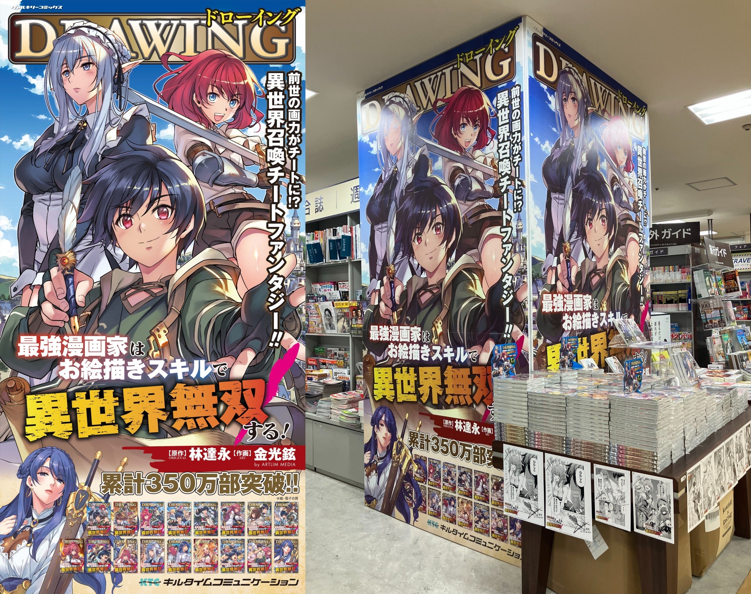 累計350万部突破!大人気異世界召喚チートファンタジー『ドローイング 最強漫画家はお絵描きスキルで異世界無双する!』の巨大パネルが旭屋書店池袋店に登場!