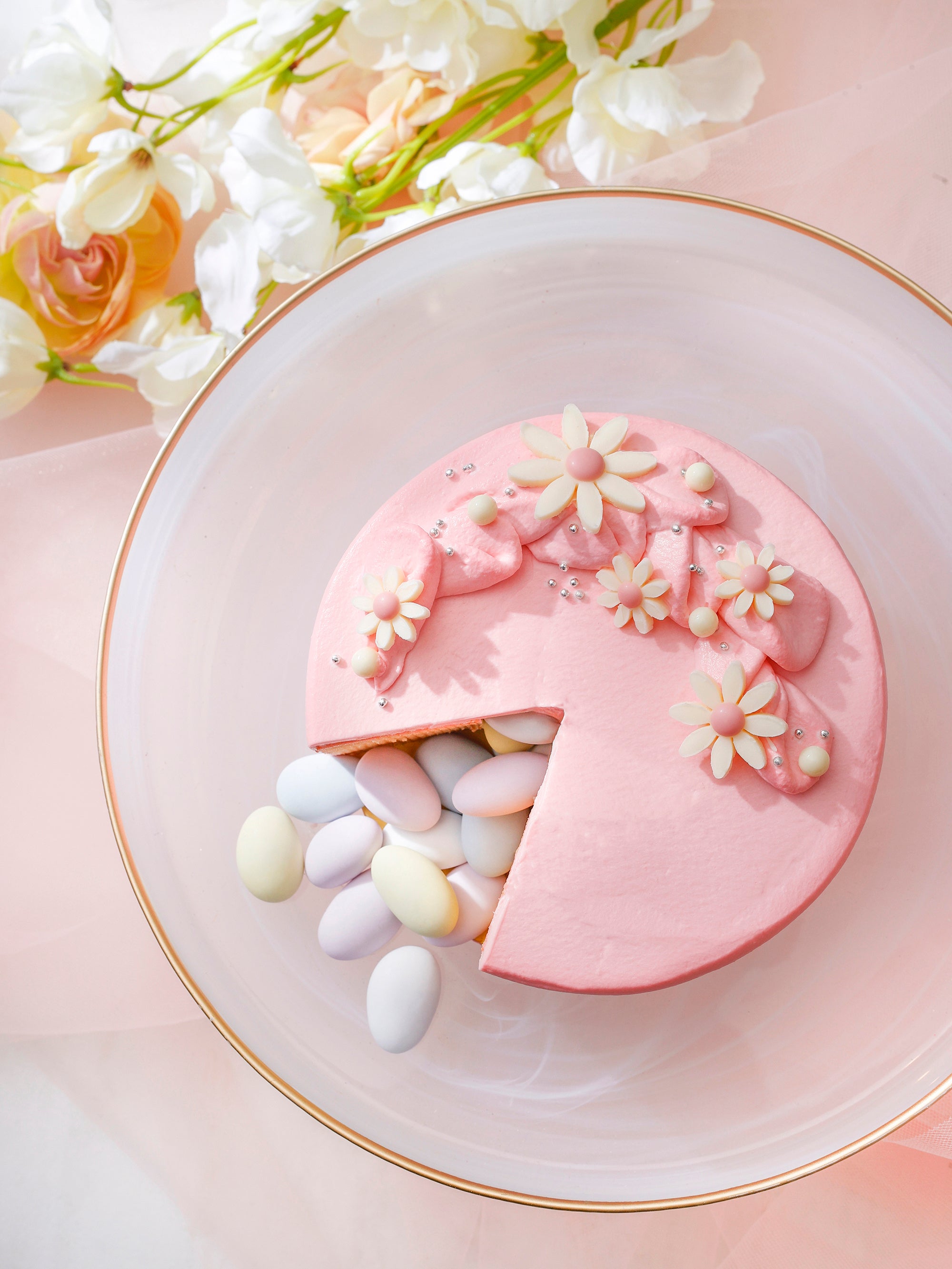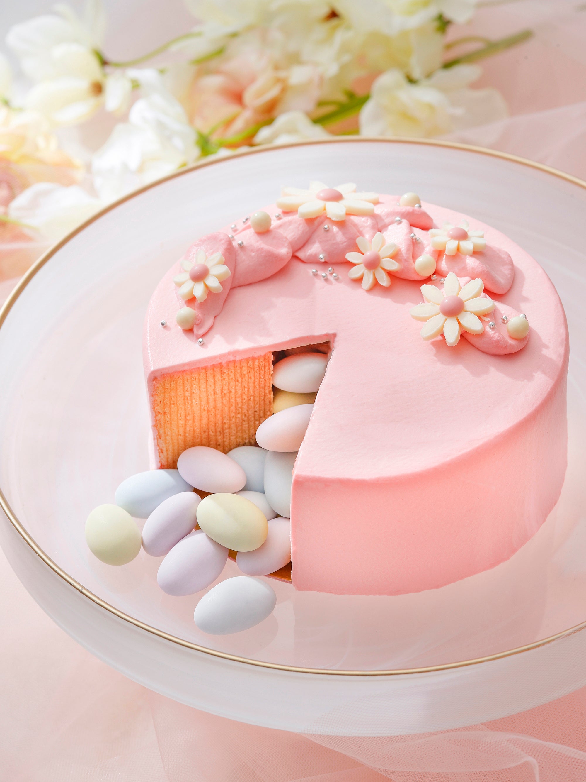 ケーキは、淡いピンクのクリームに春のお花をあしらった、やわらかく優しい印象に。カットすると中からイースターエッグのようなパステルカラーのドラジェが溢れ出し、フォトジェニックで楽しいひとときを演出いたします。中は、しっとりとした食感のバームクーヘンで、お子さまから大人まで楽しめる味わいです。