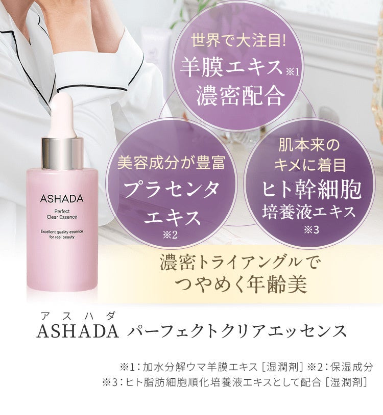 ASHADAシリーズすべての製品は“羊膜エキス”が配合されています。“羊膜エキス”にはプラセンタの約100倍もの成長因子が含まれており、さらにハーバード大学で発見された世界初の若返り因子「GDF-11」が含まれています。そのため本来持つ自ら美しくなろうとする「力」を呼び覚ますことができます。