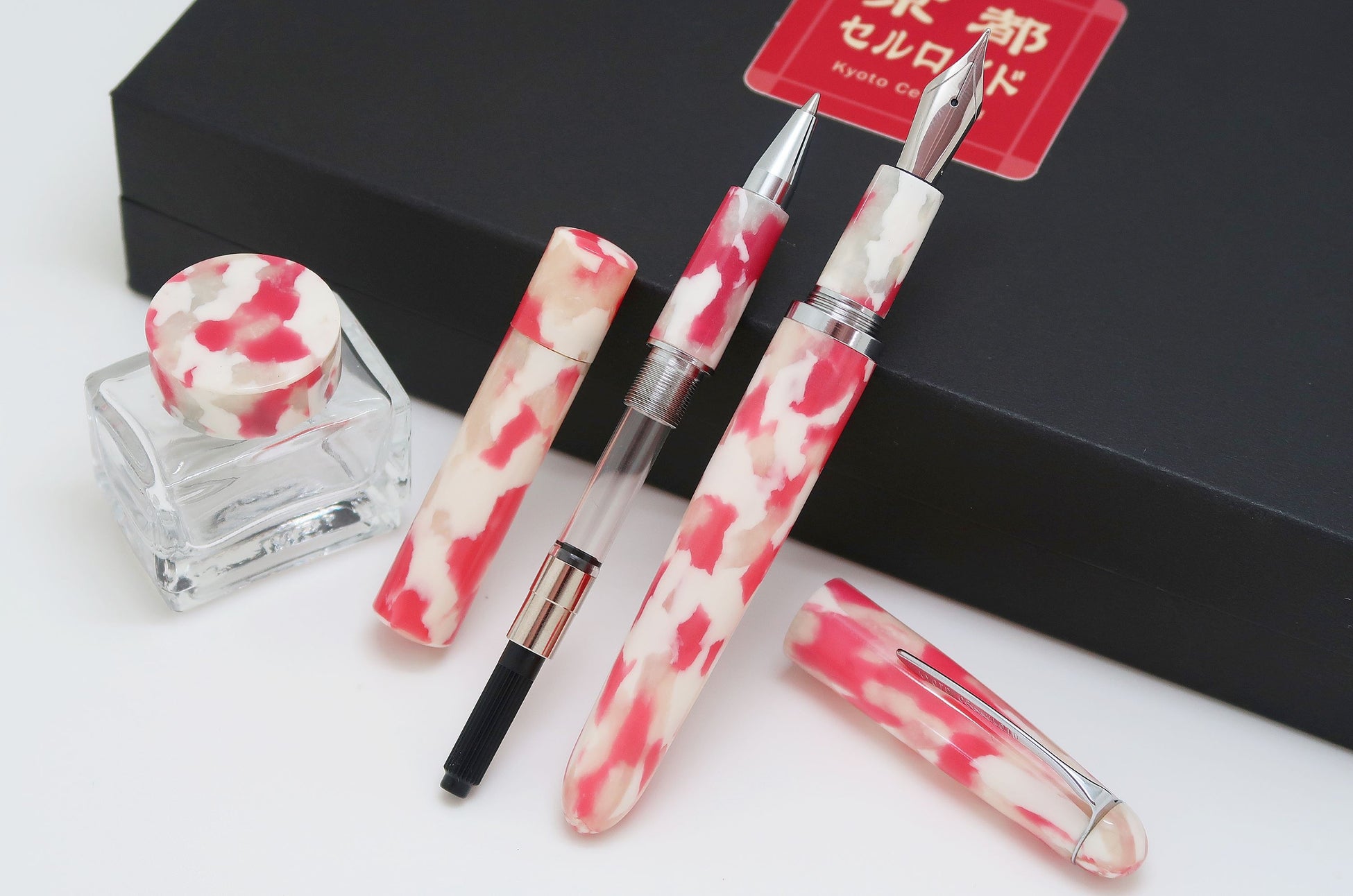 同梱内容:セルロイド万年筆(太軸)、交換用水性ボールペン先、インクボトル、コンバーター