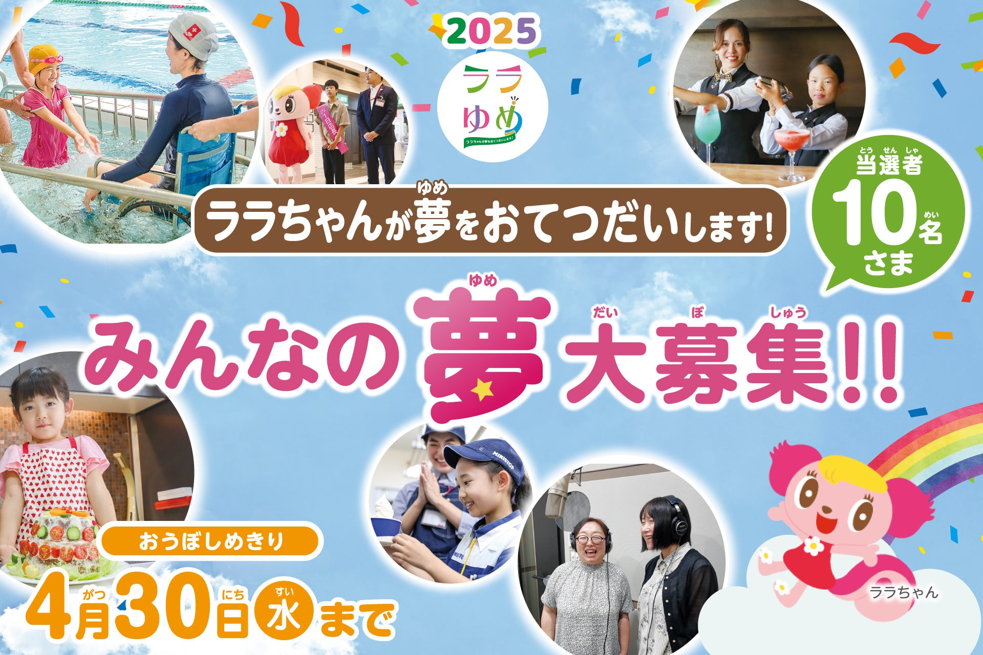 株式会社イオンファンタジー(代表取締役社長:藤原徳也、所在地:千葉県千葉市、以下、当社)は、発想豊かな夢を応援し、夢を叶えるおてつだいをする当社の社会貢献活動 『ララゆめ ~ララちゃんが夢をおてつだいします!~』(以下、『ララゆめ』)を2025年も実施いたします。3月6日(木)から4月30日(水)までの期間に夢を募集し、厳正な選考のうえ当選された10名さまの夢を叶えるおてつだいをいたします。今年はイオンのグループ企業19社が参画し、共に夢を応援いたします。