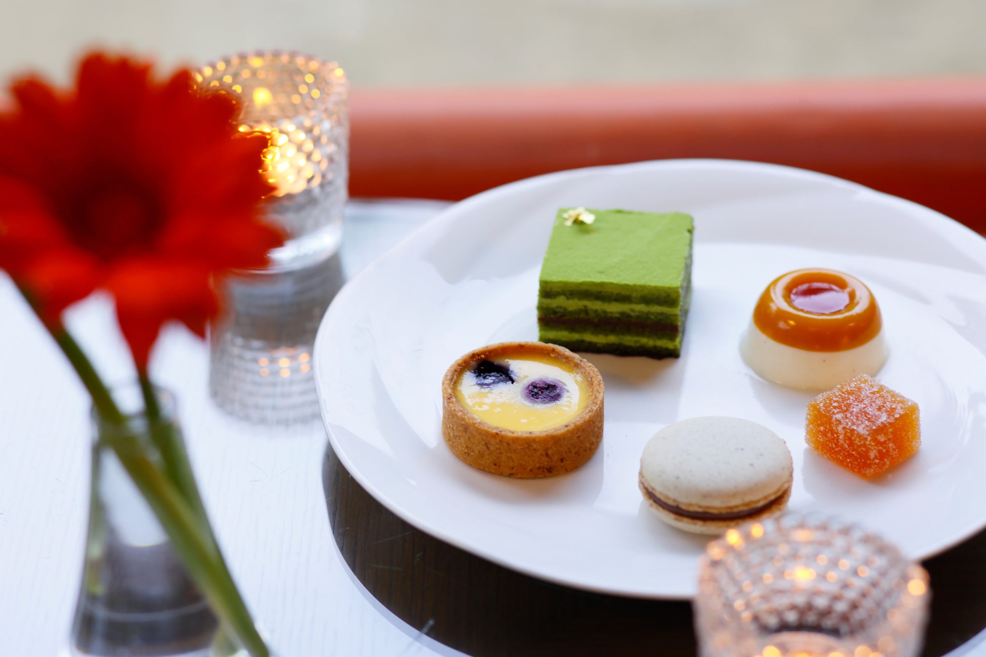 スイーツは杏とパッションフルーツの美味しさを贅沢に凝縮し、ゼリーやグミとは一味違う食感を楽しめるフランスの伝統菓子「杏とパッションのパート・ド・フリュイ」や鮮やかな緑色が初夏の新緑を連想 させる「お茶のオペラ」など、食後のデザートにピッタリなパティシエ厳選の5品をご用意いたします。