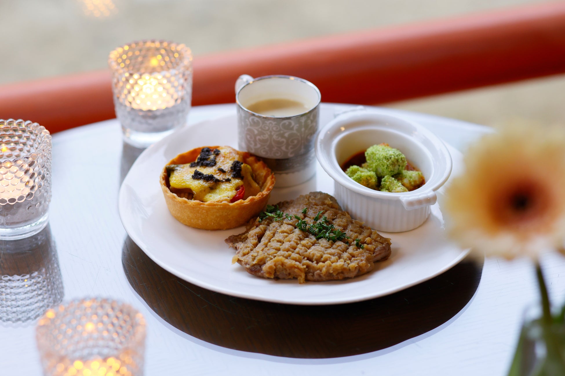 ディナー代わりにもなるセイボリーは、彩り豊かな冷菜と、ステーキやグラタンなどボリュームも抜群 な温菜の全8品をご提供いたします。その中でも、トマトの爽やかな酸味が引き立つスペイン料理の冷製 スープ「ガスパチョ」と奈良県桜井地方の特産品「三輪素麺」を合わせた「ガスパチョとそうめん きゅ うりのヴィネグレットソース」は、トッピングに花穂紫蘇があしらわれ、見た目・味わいともに初夏の訪 れを感じられる一品です。