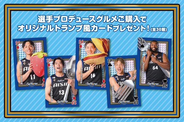 選手プロデュースグルメをご購入いただいた方には、オリジナルノベルティ「トランプ風カード」をプレゼント!