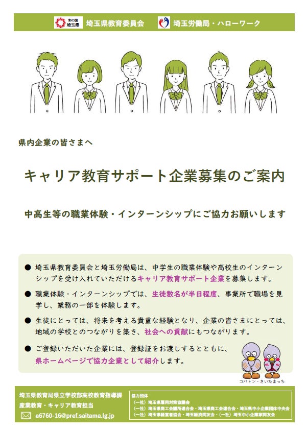 埼玉県教育委員会及び埼玉労働局では、県内経済団体と連携して、中学生の職場体験や高校生のインターンシップを受け入れていただける「キャリア教育サポート企業」を募集します。