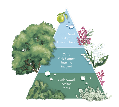 ●トップで軽やかに香るイリス、みずみずしいジャスミンなどのフローラルに包まれ、大自然の懐へ。静寂のメディテーションを思わせるアンバーにセダーウッド、モスなどの香りによって、温度ある深い森の中へと誘われていきます。