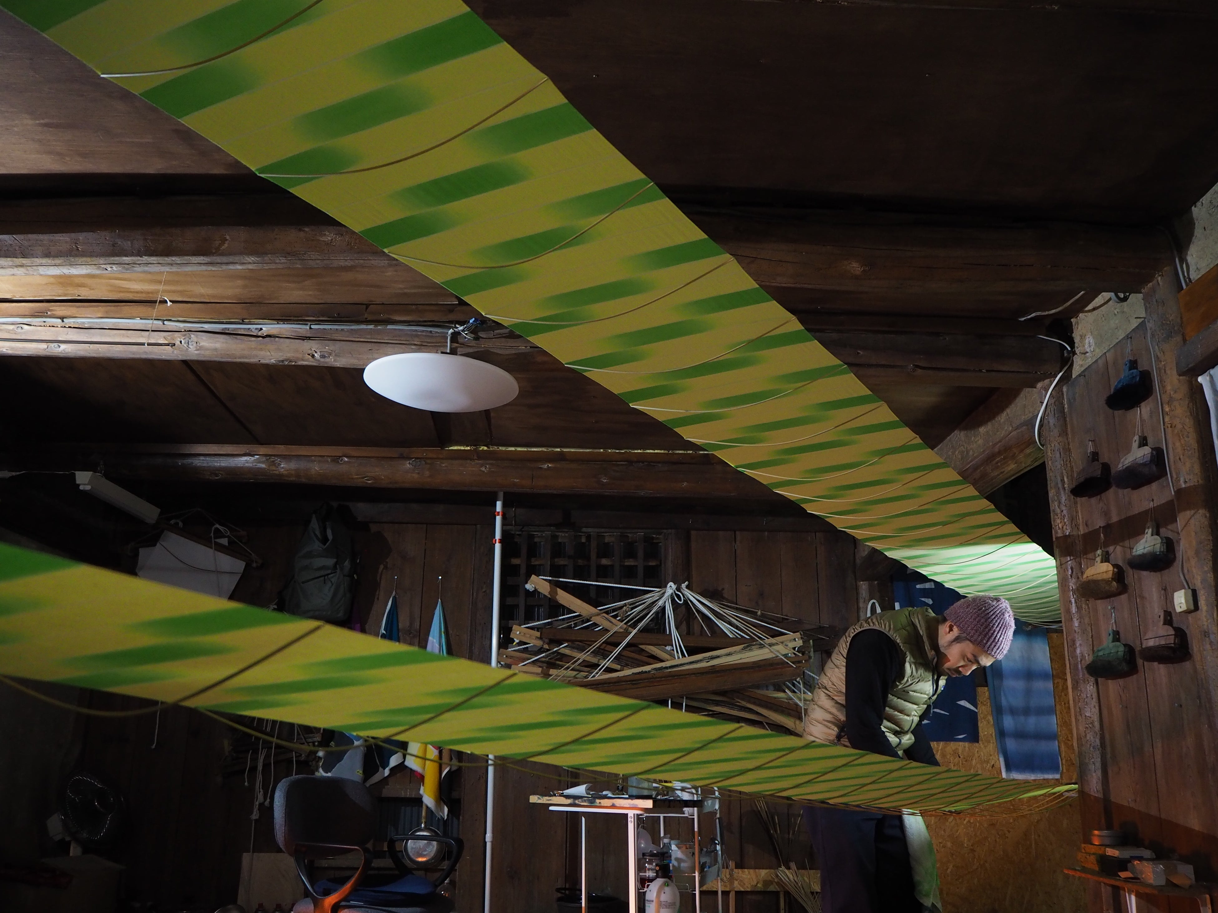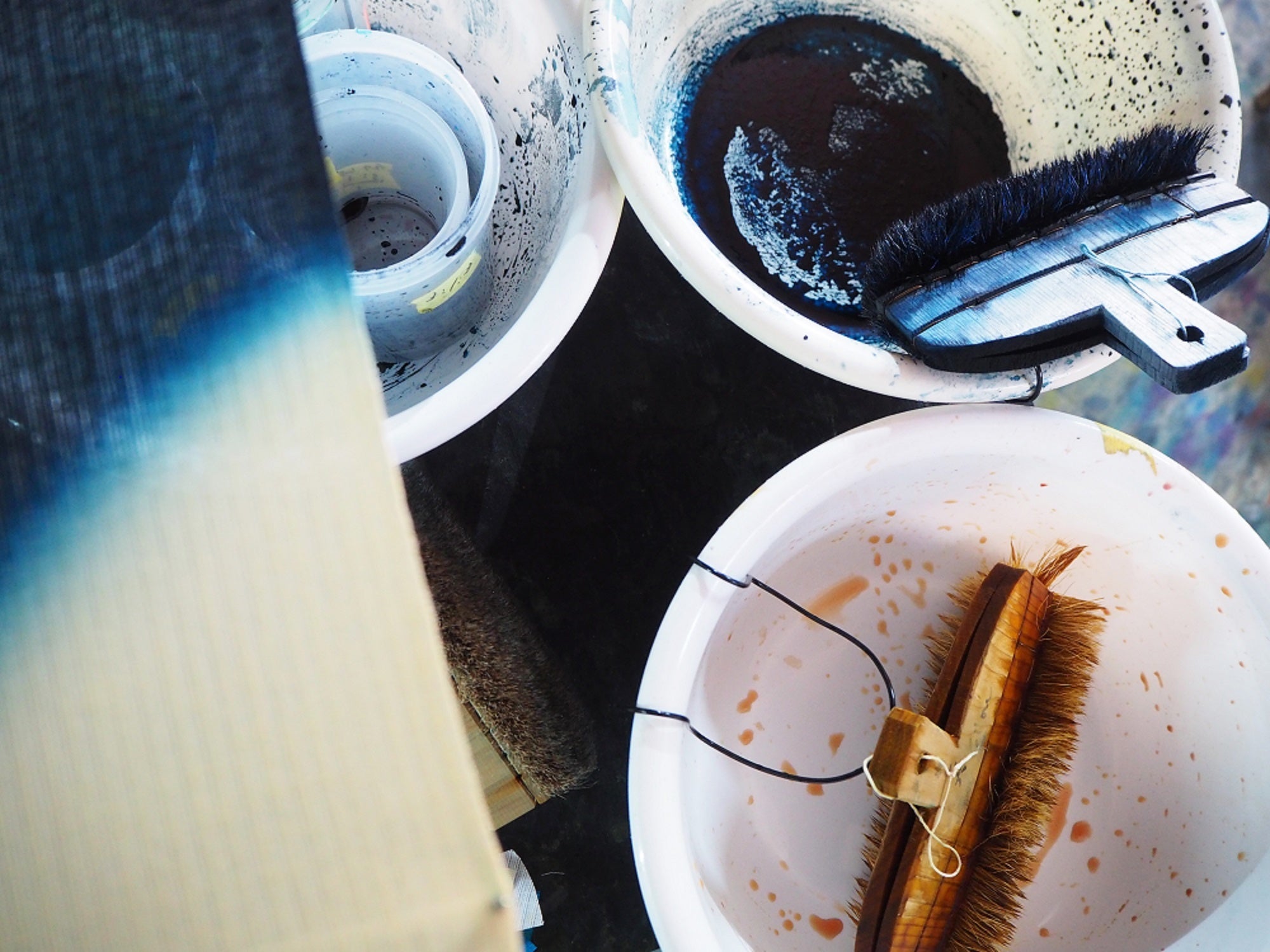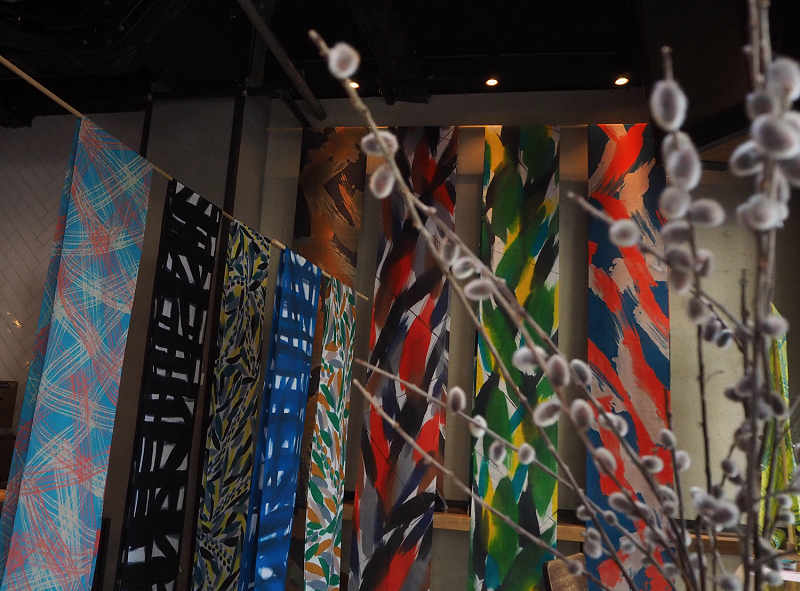 | 想いを込めて染め上げるストーリー 「引き染め」とは、昔から日本にある染めの技法の一つ。生地の両端を木で挟み、生地を引っ張りながら広げ、刷毛を使って色を染めていく。気象条件や気温、湿度、布の高低差によっても仕上がりに影響の出る、手間のかかる染め方。 中嶋が手がける引き染めは、大胆な色づかいでありながら、細部まで一つひとつ繊細に描かれる。機械では表現できない微妙なこだわり。さらにその時の自然環境がもたらす絶妙なにじみやゆらぎが加わることで、いっそう存在感が深まり、唯一無二の作品が生み出される。 |