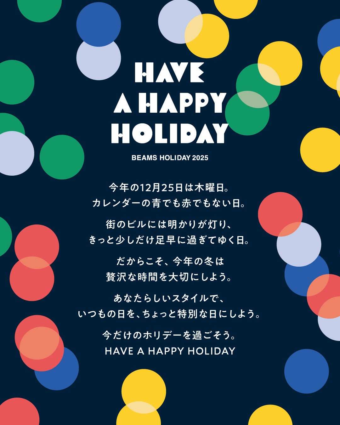 株式会社ビームス(本社:東京都渋谷区、代表取締役社長:設楽洋)は、2025年のホリデーシーズンに向けて、『BEAMS HOLIDAY 2025』を、2025年11月21日(金)から12月25日(木)の期間で、全国のビームス店舗および公式オンラインショップで展開いたします。
