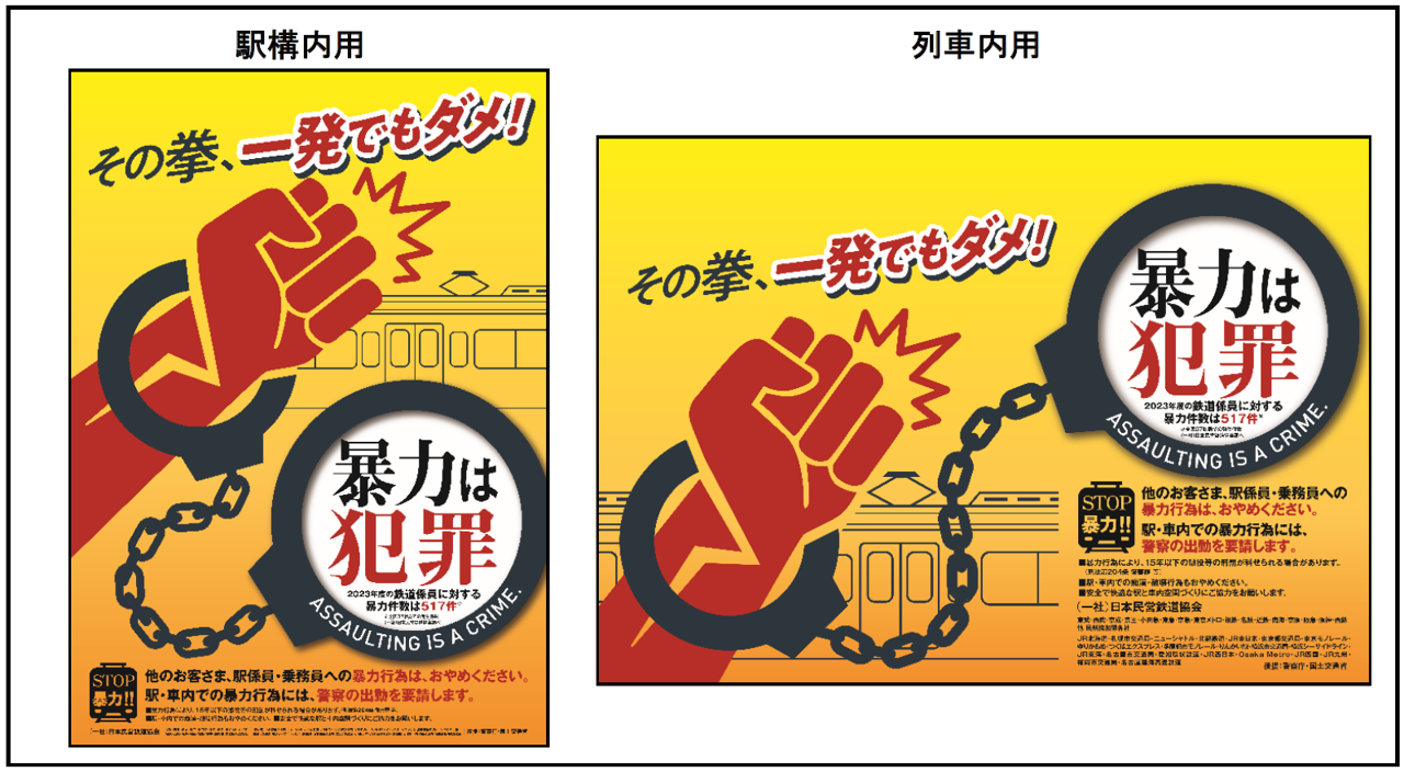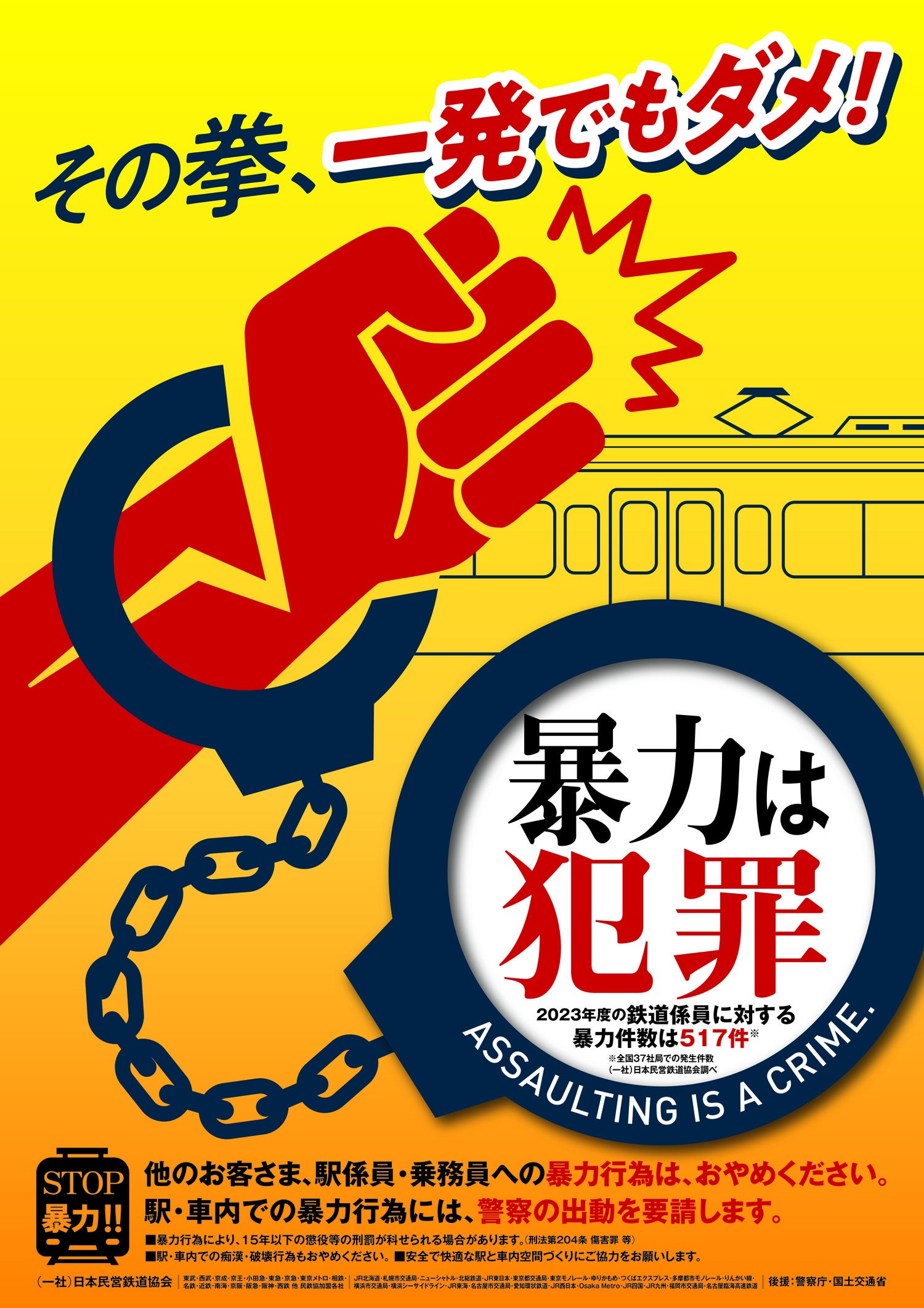 日本民営鉄道協会、JR北海道、JR東日本、JR東海、JR西日本、JR四国、JR九州、札幌市交通局、東京都交通局、横浜市交通局、名古屋市交通局、福岡市交通局、ニューシャトル、北総鉄道、東京モノレール、ゆりかもめ、首都圏新都市鉄道、多摩都市モノレール、東京臨海高速鉄道、横浜シーサイドライン、愛知環状鉄道、Osaka Metro、名古屋臨海高速鉄道では、この度、共同で「暴力行為防止ポスター『その拳、一発でもダメ!』」を制作し、2024年7月12日(金)から、各鉄道事業者の駅構内、列車内に掲出いたします。
