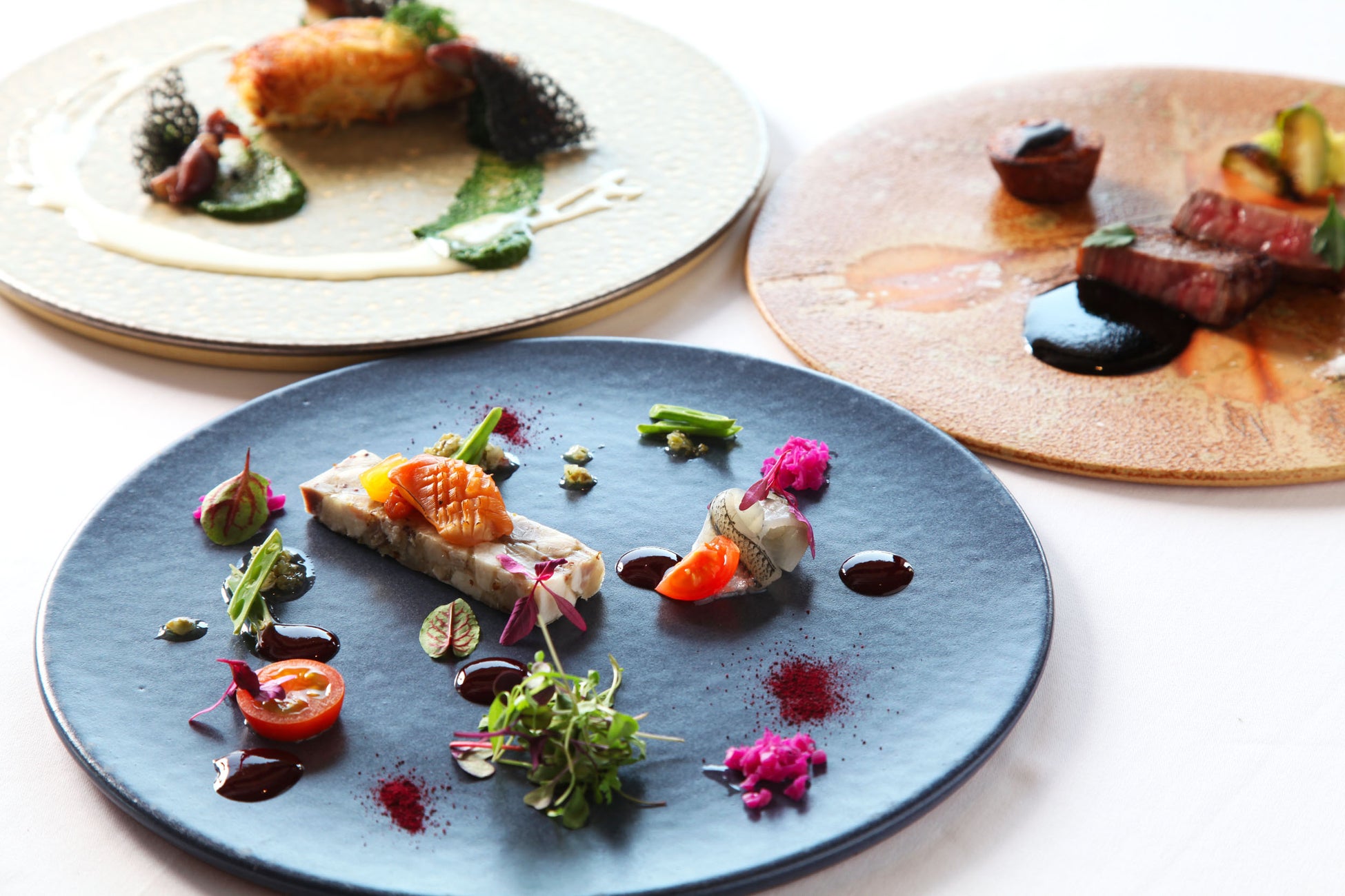 和会席またはフランス料理からお選びください。大谷焼の器がまるでキャンバスのように、鳴門桜鯛や阿波牛、旬の阿波野菜など、地元食材を使った料理を華やかに引き立てます。