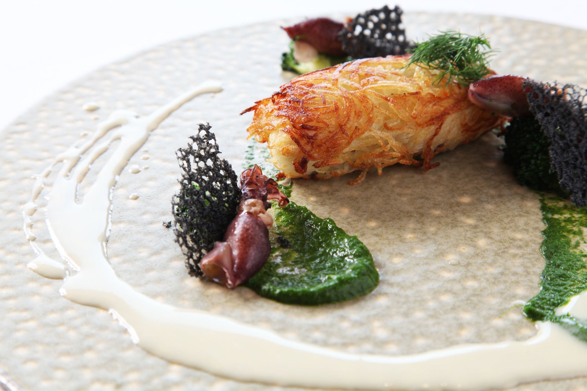 きのこのデュクセルを詰めた淡路産カレイのじゃがいもクルート