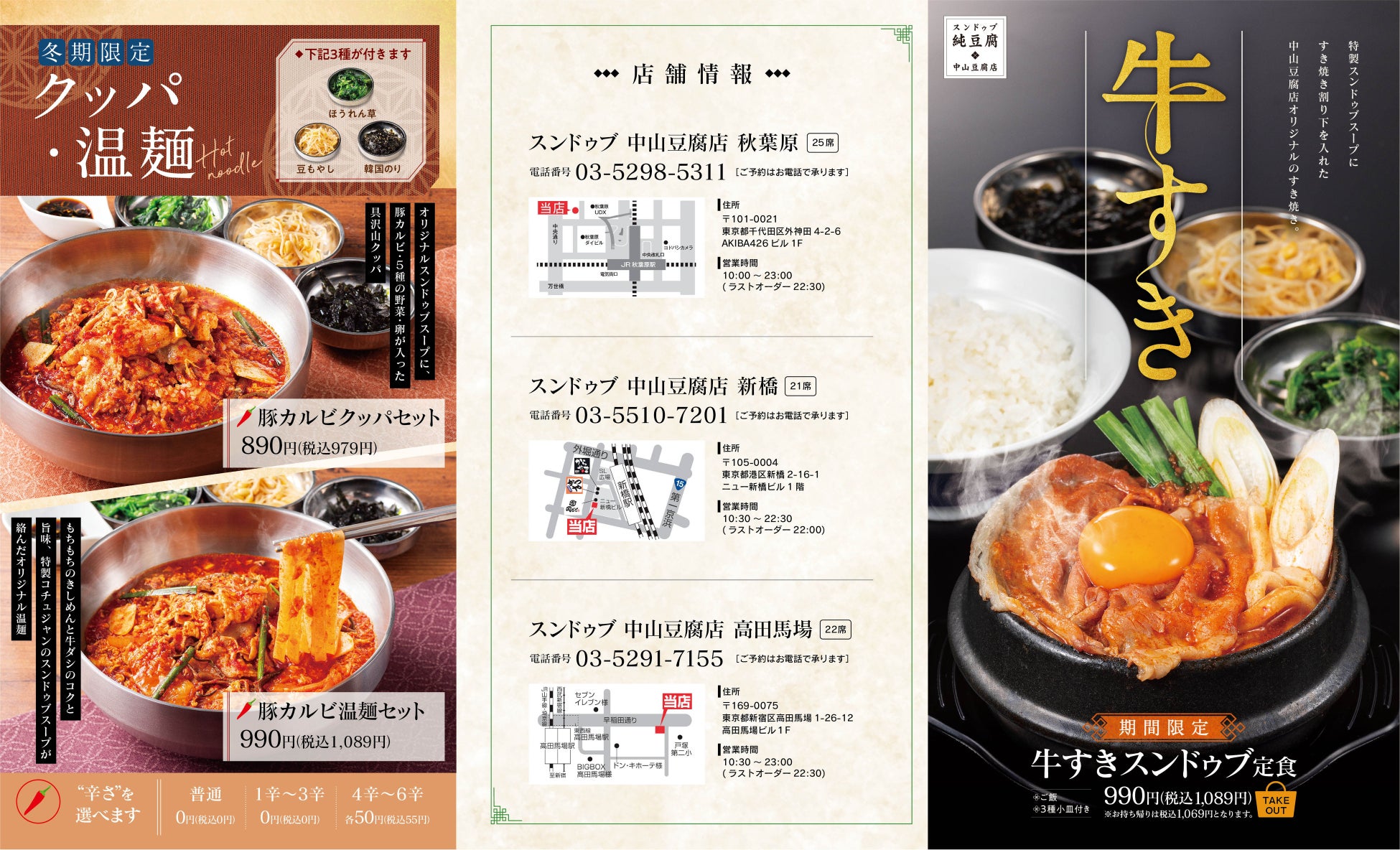 1号店は2020年5月に高田馬場、2号店は2021年9月に秋葉原へ、そして2021年12月には3号店を新橋にオープンしました。日本でも親しみのあるスンドゥブは、オヤジが入りにくい雰囲気があり価格も高め。スンドゥブ好きなオヤジでも入りやすい白を基調としたシンプルな外観にカウンター席を設置し、おひとり様でも気軽にお食事いただけます。