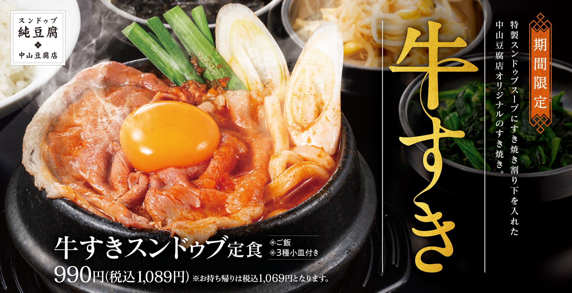国産大豆トヨマサリと、自家製豆腐とオリジナルのタテギと野菜をペースト状にしたオリジナルスープがこだわりの「スンドゥブ 中山豆腐店」にて、冬の風物詩をスンドゥブに仕立てた新メニュー「牛すきスンドゥブ定食」を2023年12月13日(水)より販売を開始いたします。