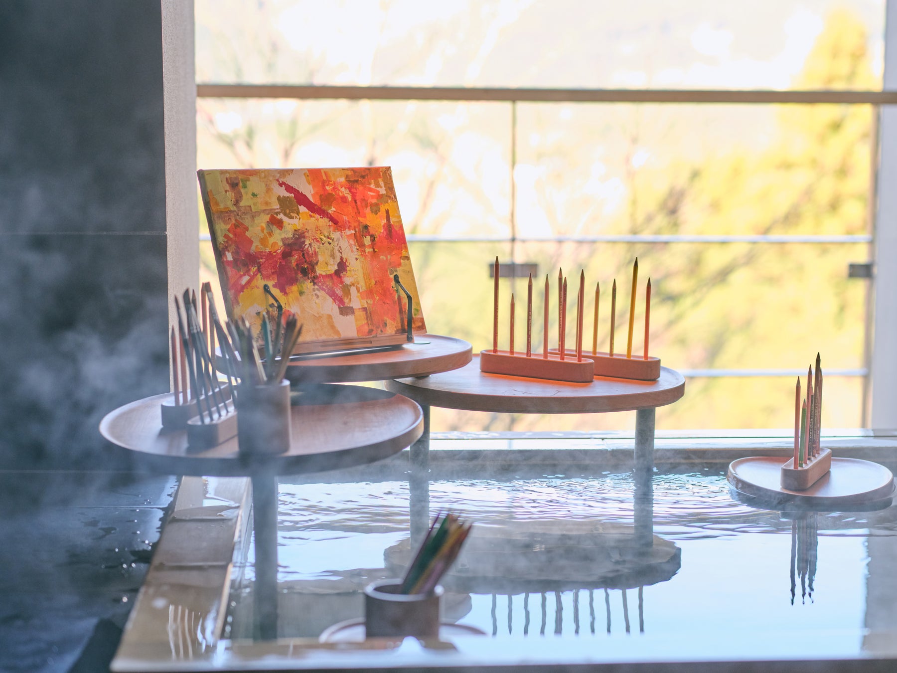 客室の露天風呂に浸かりながら、絵を描くことができる「温泉パレット」セットを準備します。ひとりだけの空間でリラックスしながら、非日常な体験ができます。