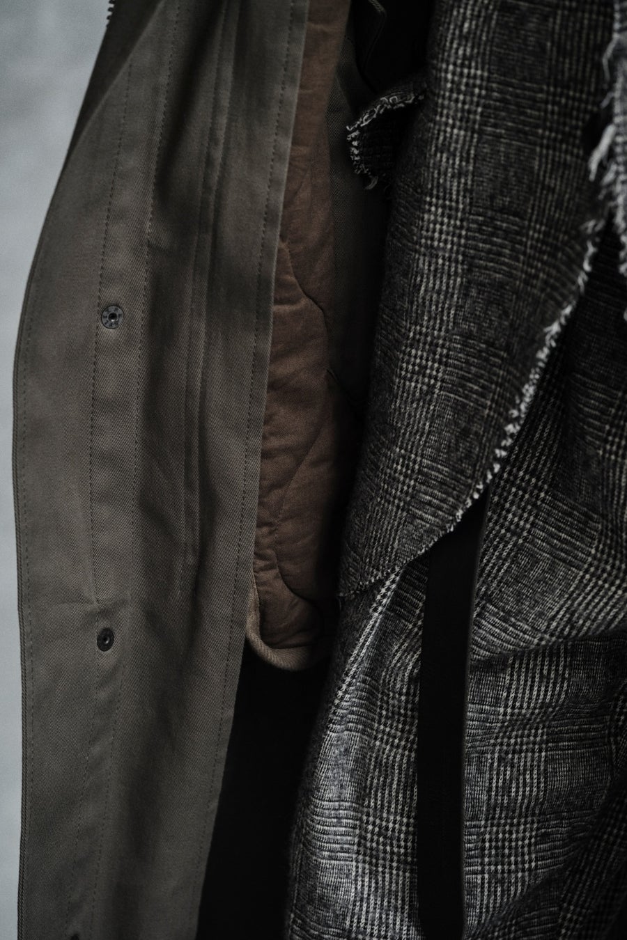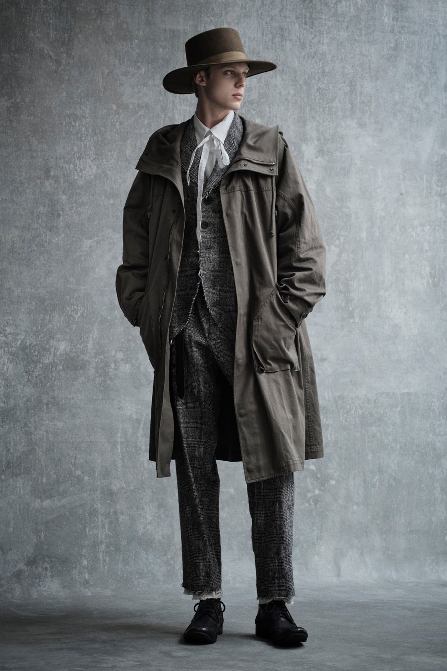 立体感のあるヨークスリーブが特徴的なライナー付きのモッズコート。中には裁ち切りのセットアップとリボン付きシャツを合わせ、トラッドに遊びを持たせたスタイルに。ワイドブリムハットがその佇まいをさらに際立たせる。