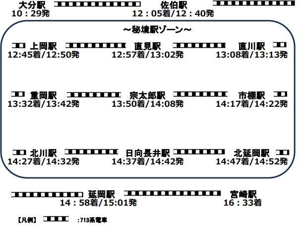 鹿児島中央から大分への旅は夜行列車として運行し、大分から宮崎の旅では、秘境駅として名高い「宗太郎駅」をはじめ佐伯駅から延岡駅の間の各駅に停車します。3つのツアーそれぞれに特徴があるツアーです。この機会にぜひ、713系の魅力をお楽しみください。