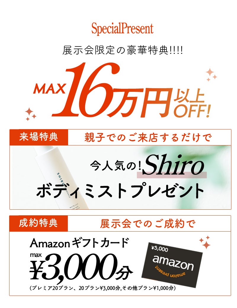 親子で来店するだけでもらえるSHIROボディミストや、amazonギフトカード最大¥3,000プレゼント。