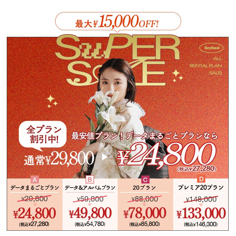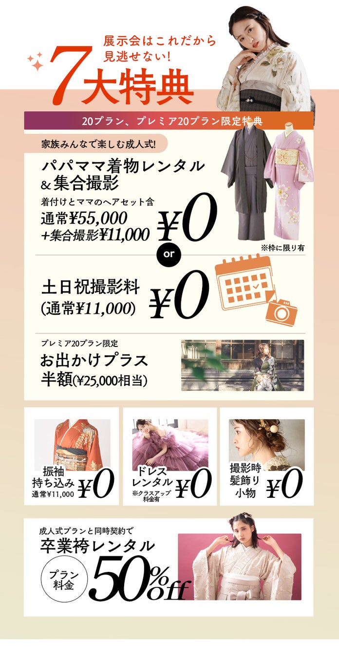 そのほか「家族で楽しむ成人式」として、パパママの着物レンタル&集合撮影や、同時契約で卒業袴レンタルが50%OFFになるキャンペーンも実施。