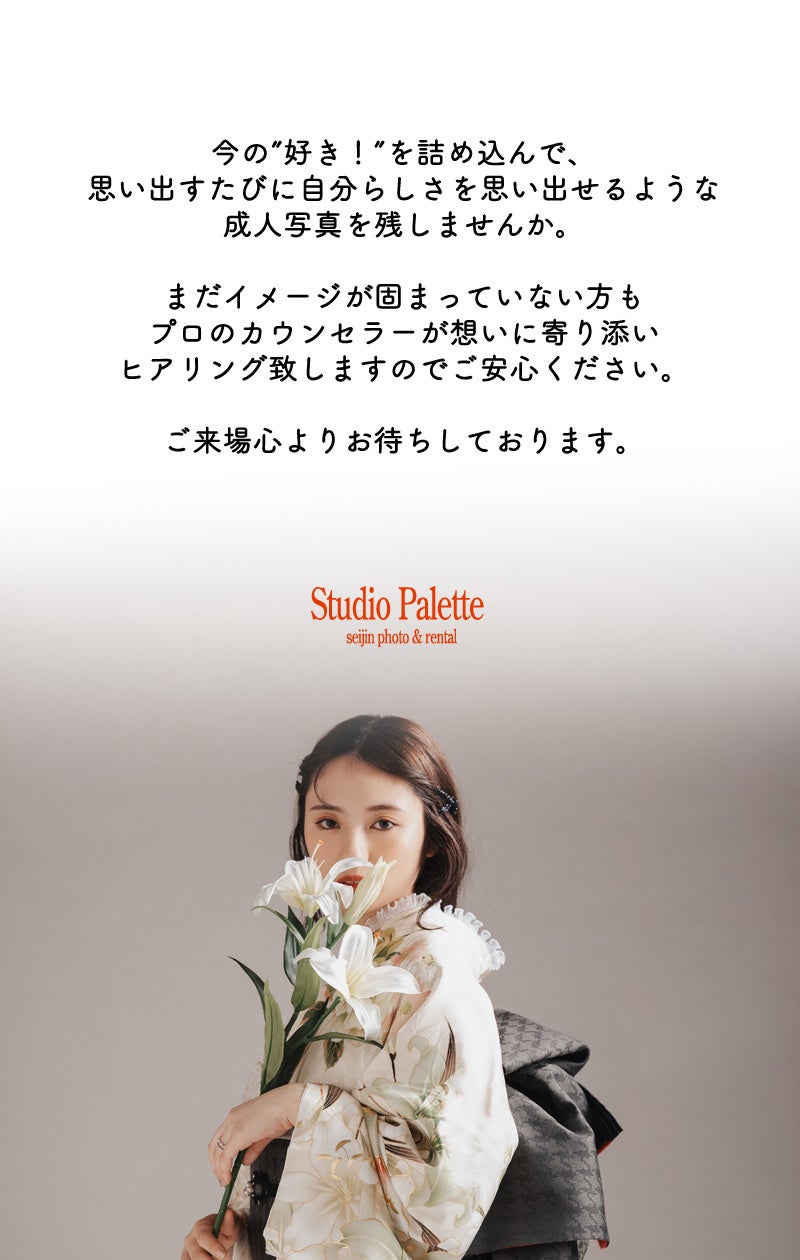 成人式は参加しない、写真だけという方にも。北海道のフォトスタジオPaletteより、「わたしだけの、わたしらしい成人式」を迎えていただくための二十歳向けイベントを開催いたします。