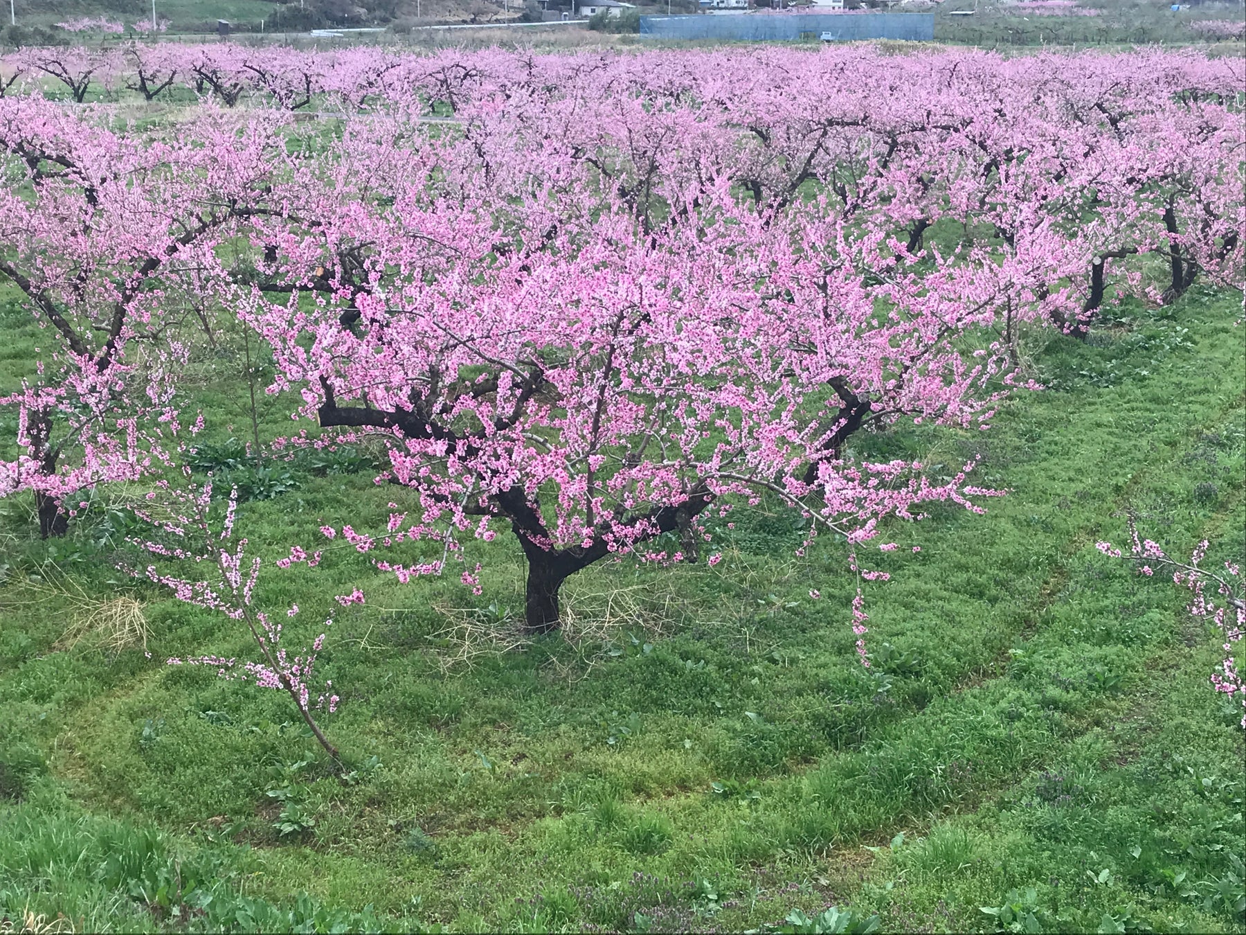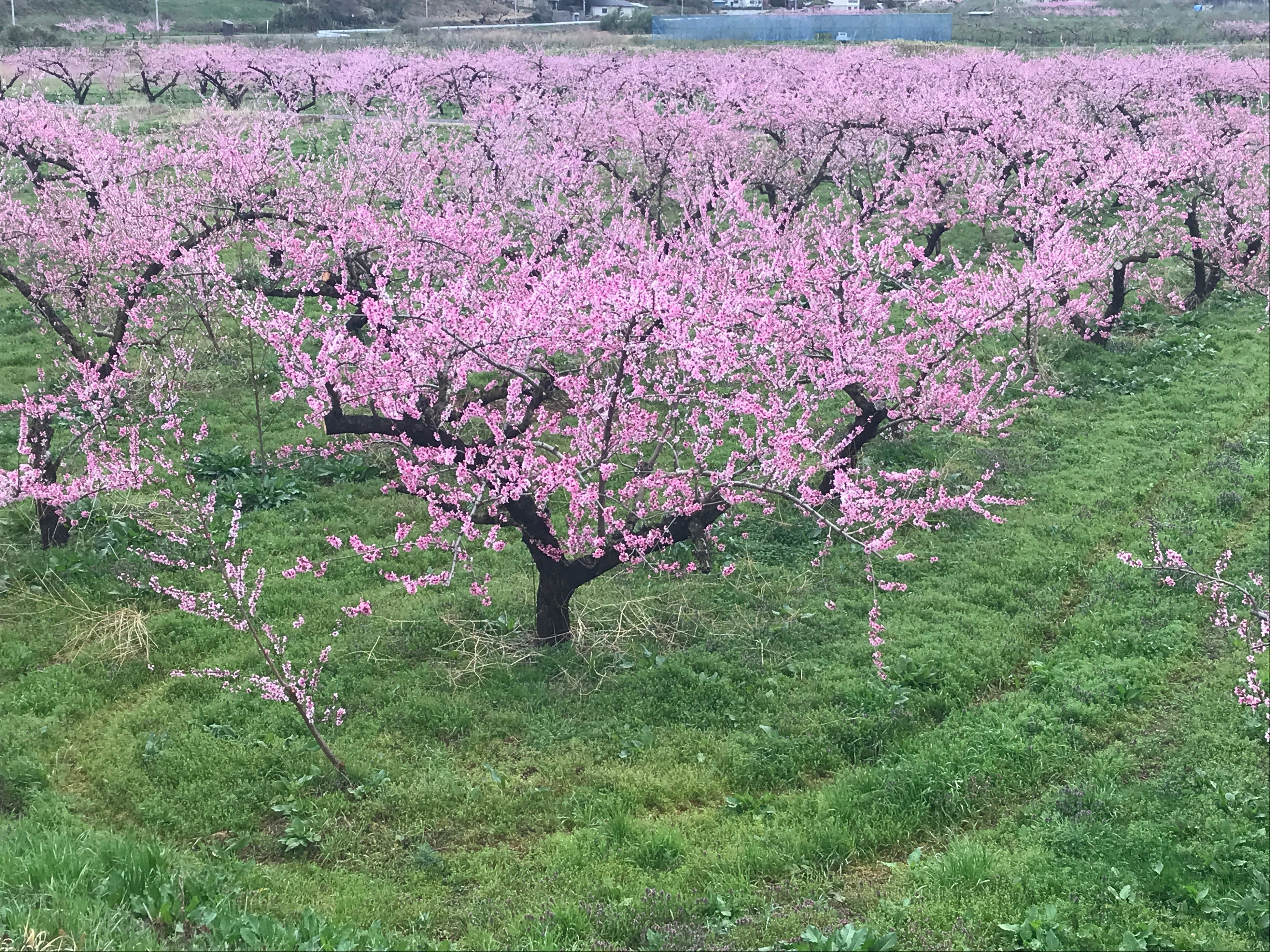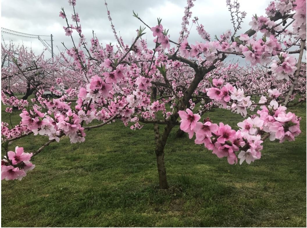 ※農家さまの桃畑の写真。見事な桃の花が咲いています。