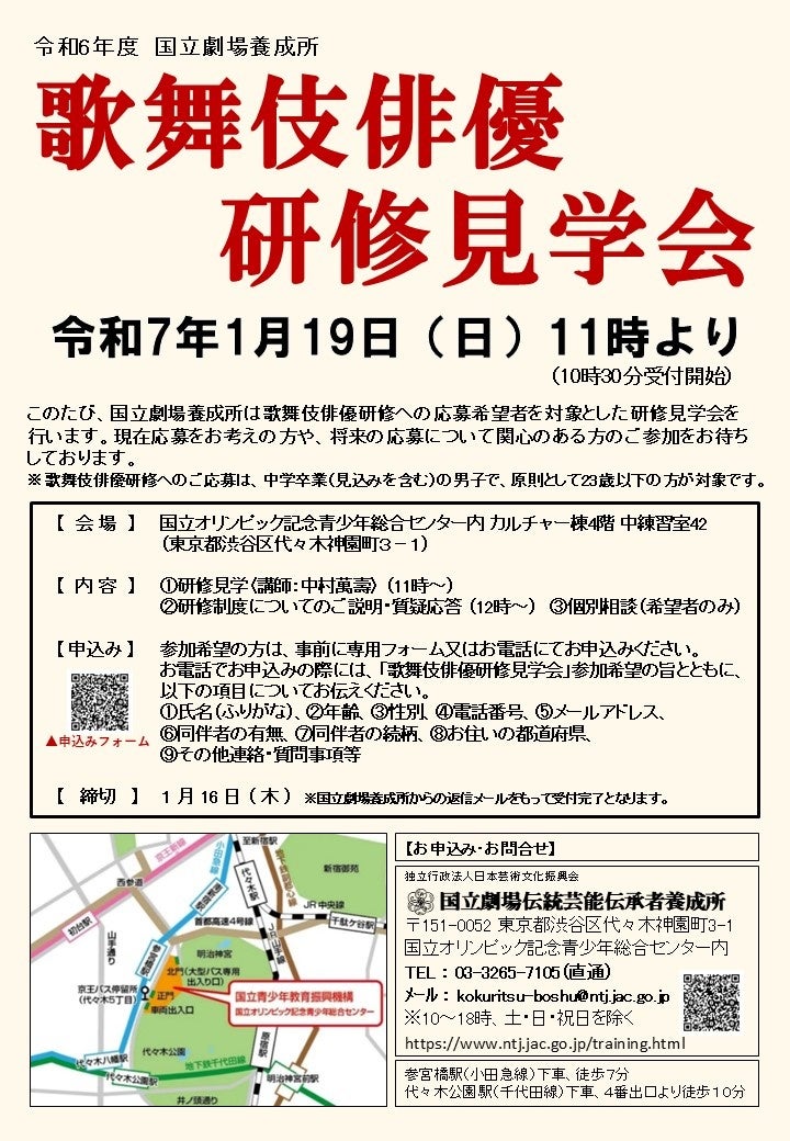 国⽴劇場養成所では、1⽉19⽇(日)に歌舞伎俳優研修への応募希望者を対象とした研修⾒学会を開催いたします。現在応募をお考えの⽅、将来の応募について関⼼のある皆様のご参加をお待ちしております!