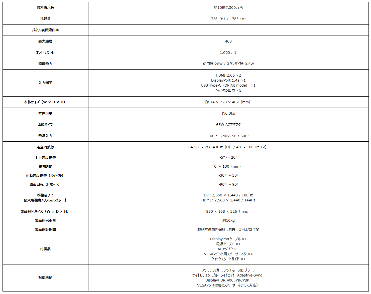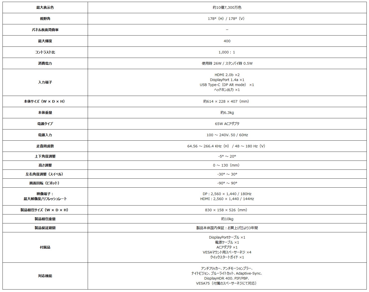 「G274QPF E2」はフルHDの約1.8倍の情報量で高精細な表示が可能なWQHD(2,560 × 1,440)解像度、高画質と高速応答を実現したRAPID IPSパネルを採用しており、一般的な144Hzのゲーミングモニターと比べ毎秒36フレームも高速なリフレッシュレート180Hz、応答速度1ms(GTG)の高いスペックを誇り、高精細かつ残像感の少ない映像で快適にゲームプレイを楽しむことができます。さらに、リアルな映像を表現可能なDisplayHDR 400、同期機能としてAdaptive-Sync、暗いシーンでも視認性を上げるナイトビジョン機能、多機能スタンドで高さ調整や90°回転させ縦表示にすることで対応ゲームやSNSの閲覧にもお勧めです。また、長時間の使用において目の疲労を軽減するアンチフリッカー、ブルーライトカット機能を搭載し、Adobe RGBカバー率:94%、DCI-P3カバー率:93%と広色域表示に対応、1台でゲーミング・クリエイター用途にご使用可能なハイスペックモデルです。入力端子はHDMI 2.0b ×2、DisplayPort 1.4a ×1、USB Type-C(DP Alt mode)×1に対応しており、PCとゲーム機など複数の機器を接続する事が可能です。背面のジョイスティックを操作することで簡単に入力切り替えやメニュー操作を行うことができます。VESA規格にも対応しており、付属のスペーサーネジを使用する事でモニターアームに取り付ける事が可能です。