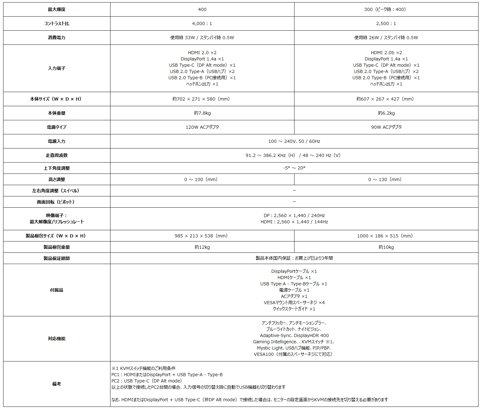 どちらのモデルも共通スペックとして肉眼とほぼ同じ湾曲率1,000Rで、使用者の視界を覆うため集中力が高まりやすく、プレイヤーのパフォーマンスを高く引き出すことができます。また、フルHDの約1.8倍の情報量で高精細な表示が可能なWQHD(2,560 × 1,440)解像度、引き締まった黒を表現可能な高いコントラスト比と高速応答を実現したRAPID VAパネル、一般的なゲーミングモニターと比べ約2倍のリフレッシュレート240Hz、応答速度1ms(GTG)の高いゲーミング性能を搭載し、メリハリのある映像と高い没入感を両立したゲーム体験を楽しめます。さらに、リアルな映像を表現可能なDisplayHDR 400、2台のPCでUSB機器を共有可能なKVMスイッチ、PC上からモニターの設定が可能なGaming Intelligence、同期機能としてAdaptive-Sync、暗いシーンでも視認性を上げるナイトビジョン、本体背面に鮮やかなLEDを搭載し、色や光るパターンを設定できるMystic Light機能を搭載したハイスペックモデルです。長時間の使用において目の疲労を軽減するアンチフリッカー、ブルーライトカット機能を搭載しております。VESA規格にも対応し付属のスペーサーネジを使用する事でモニターアームに取り付ける事が可能です。
