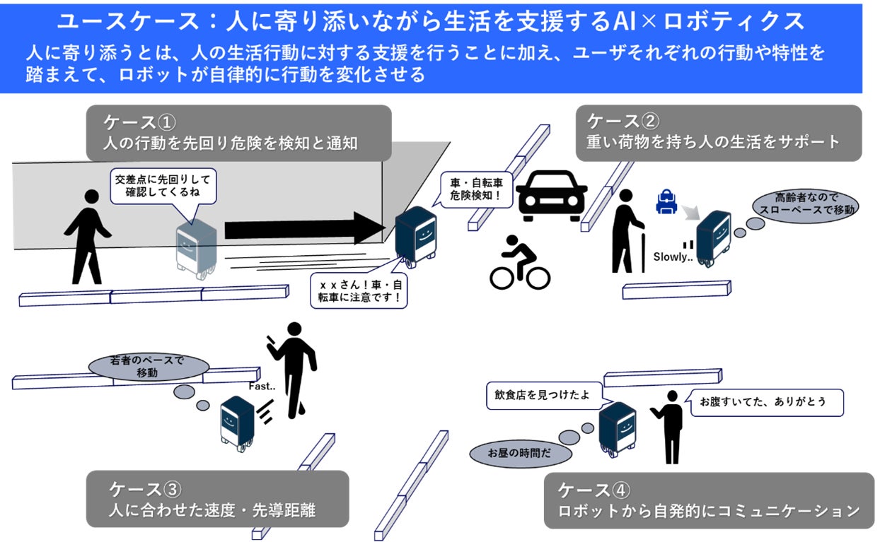 また、人に寄り添うケースとして、オーナの行動を先回りして見通しの悪いエリアへ移動し、交差点などの危険の察知・通知を行う検証を実施しています。ロボットが交差点での危険性を察知し、オーナおよび周辺への通知を行うことで、人々に安全な生活を提供します。このユースケースは、子供連れや高齢者といった方々の生活を支援するパートナーとして活用することができます。
