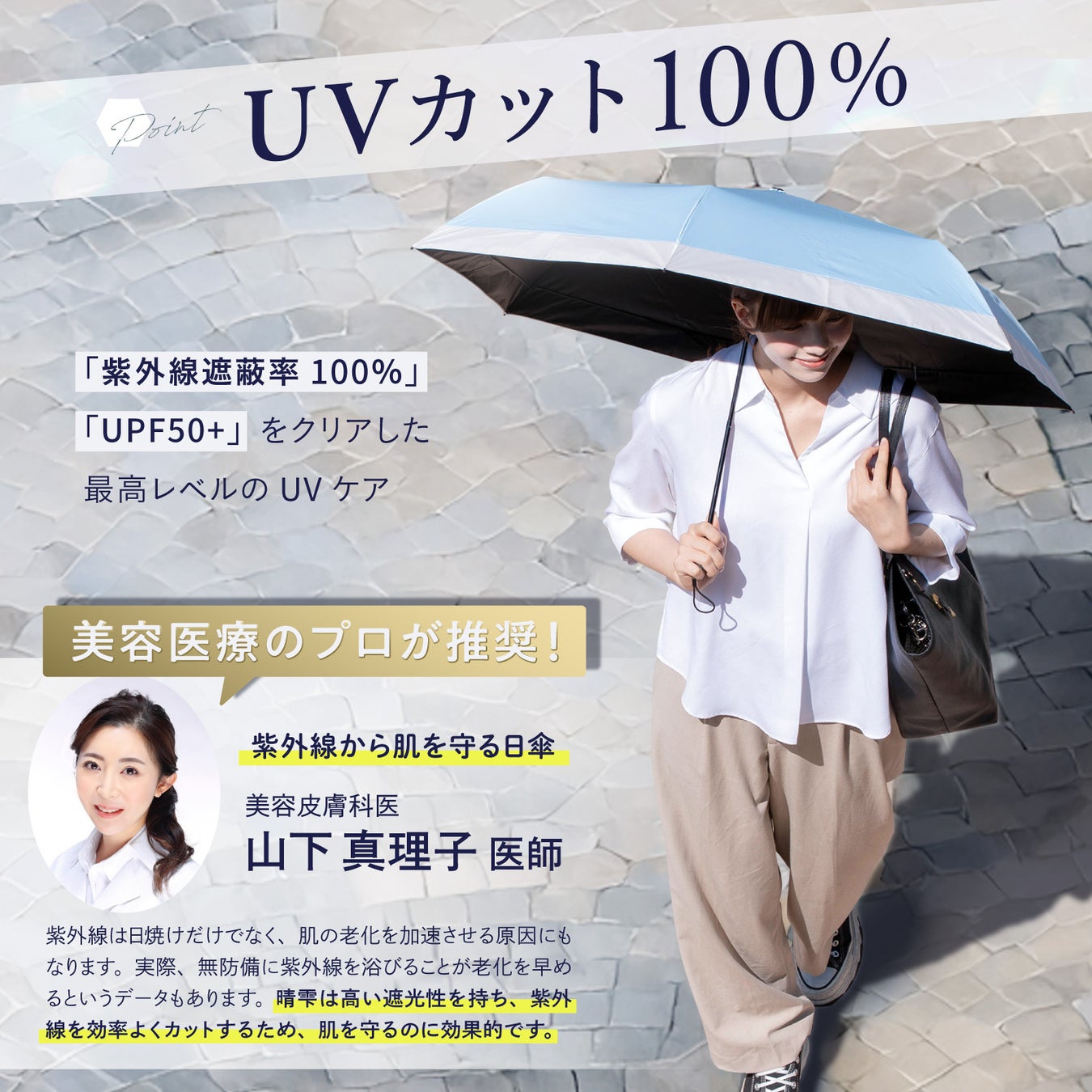 紫外線をしっかり遮るUVカット100%の生地を使用。日差しの強い日でも、紫外線対策として日常的に使いやすい折りたたみ日傘です。