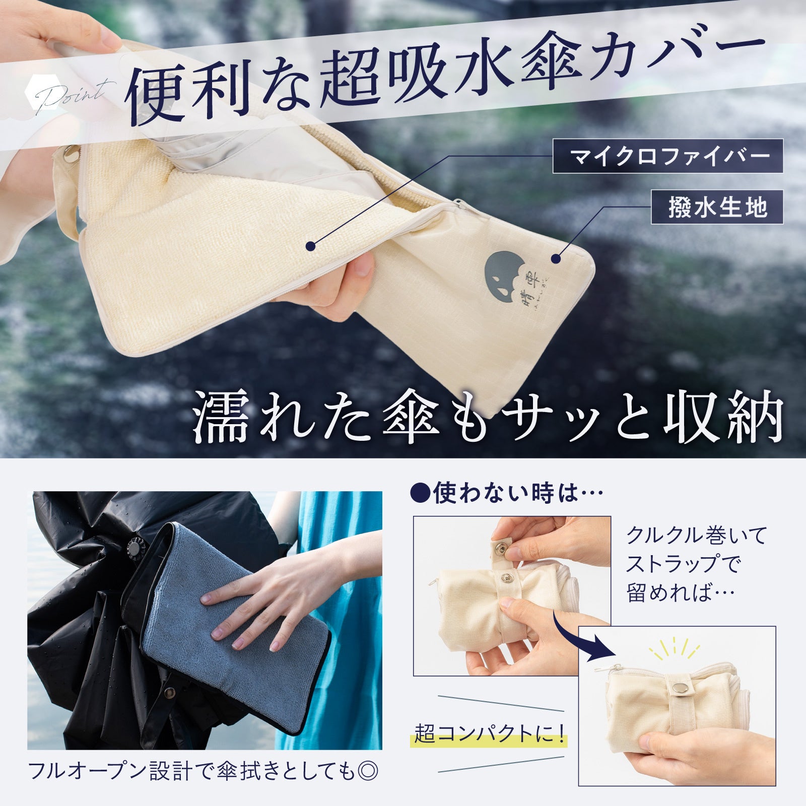 雨の日の使用後にも便利な吸水傘カバーが付属。濡れた傘をバッグに収納する際にも周囲を濡らしにくい仕様となっています。