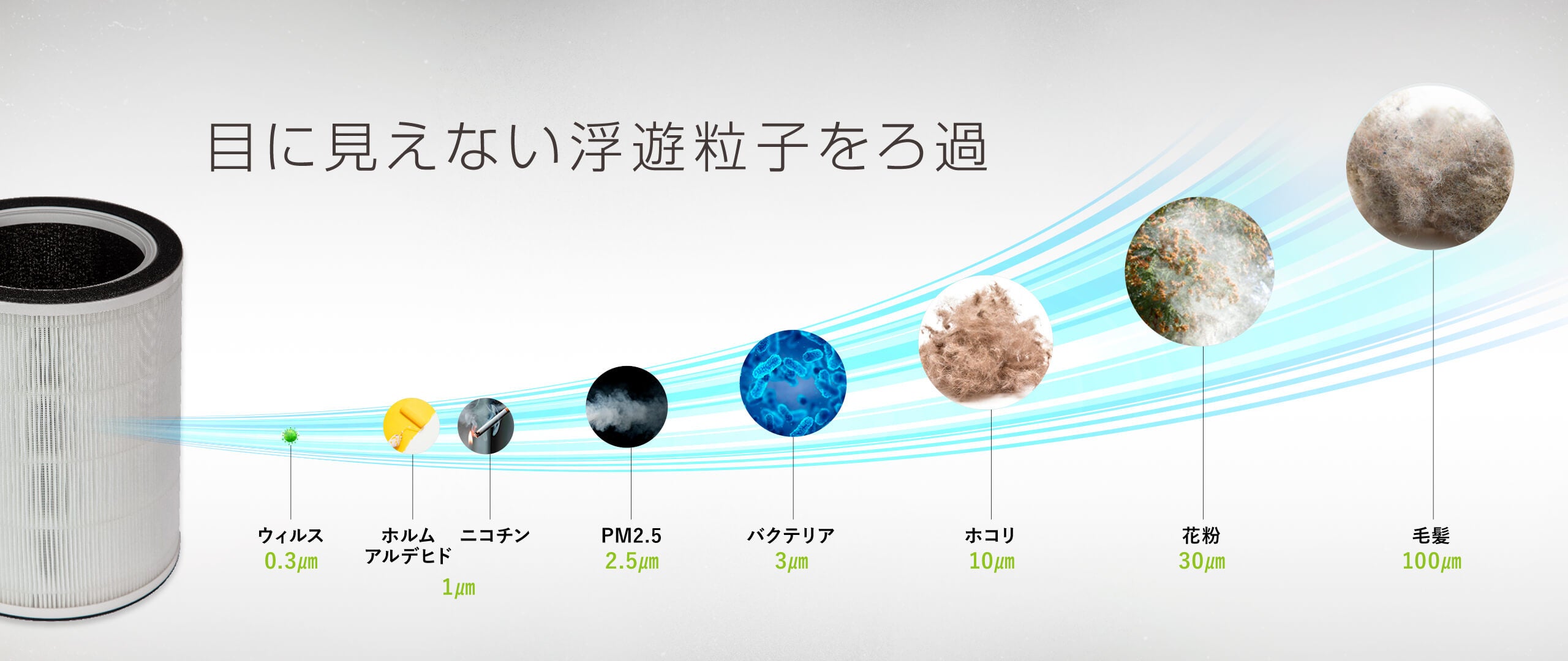 3層構造のフィルターで、花粉や空気中のホコリやバクテリアなどの微細な粒子キャッチ。さらに活性炭フィルターにはホルムアルデヒド除去コーティングが施され、有害物質を除去します。