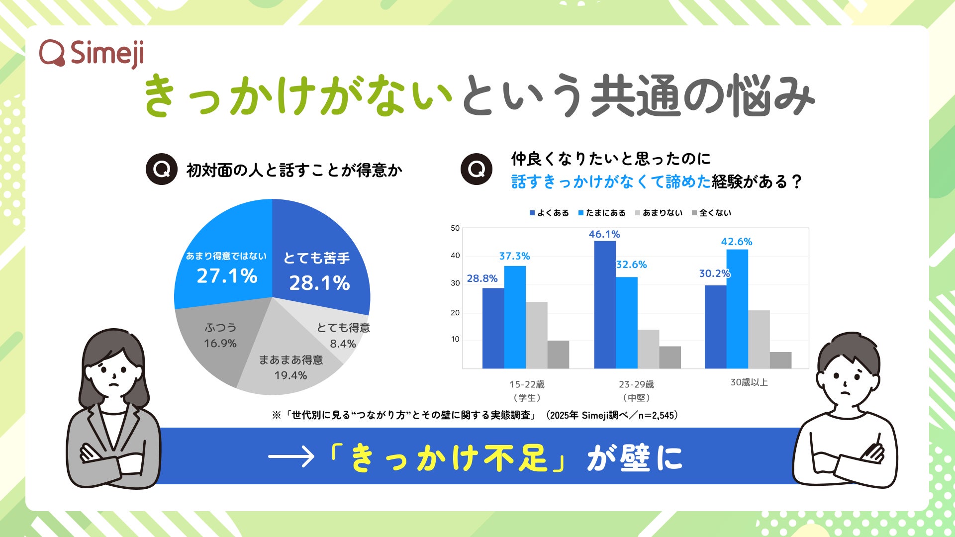 実際にSimejiが行ったアンケート調査でも、「話すきっかけがなくて諦めたことがある」「最初のひとことに悩む」といった声が多数見られました。