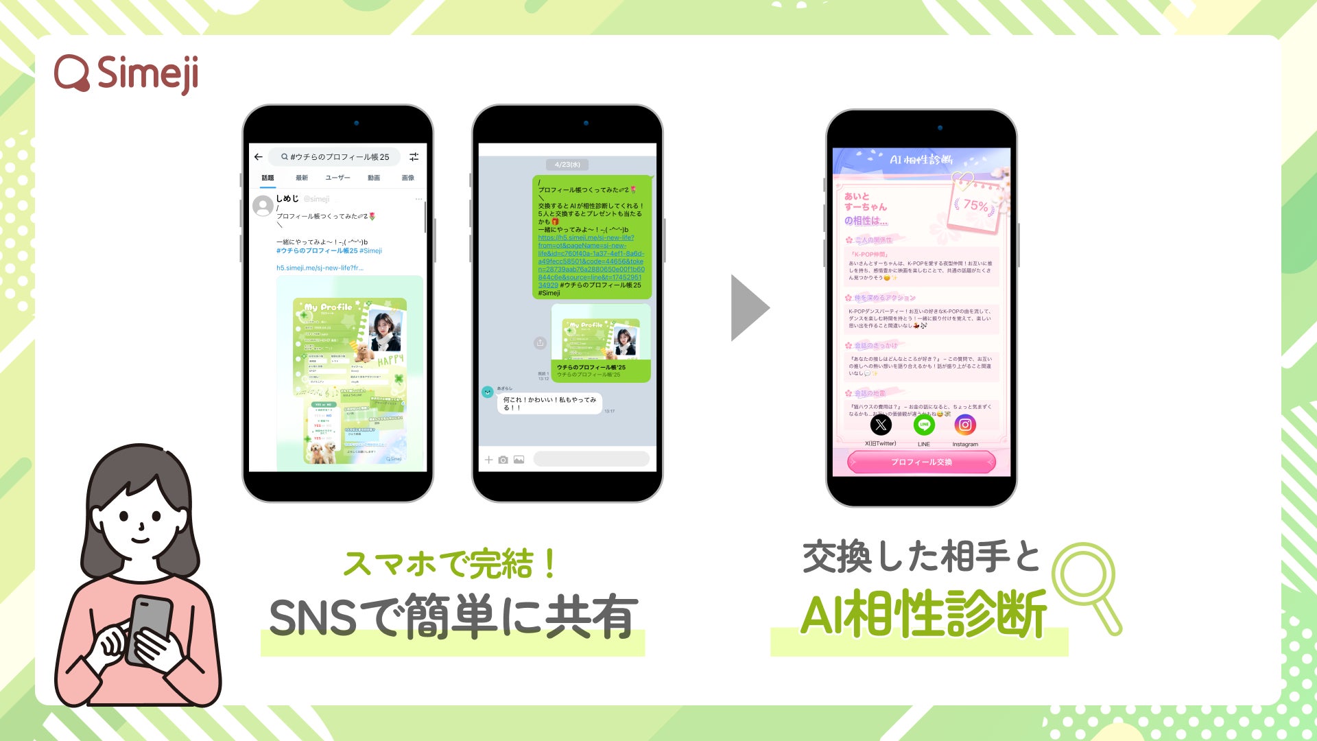「ウチらのプロフィール帳’25」は、こうした潮流に合わせて誕生した、スマホで完結する新しいプロフィール帳です。Simejiは、“話すきっかけ”を、より簡単に、よりスマートに叶えることで、円滑なコミュニケーションを後押しいたします。